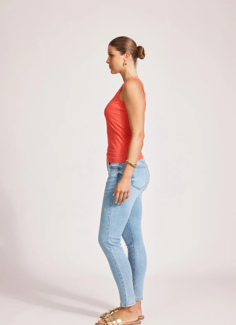 This tank features a flattering scoop neckline and a sleeveless design, crafted from soft ribbed fabric for added texture. A subtle brand logo is placed at the back of the neck, and the cotton-rich material ensures comfortable wear throughout the day