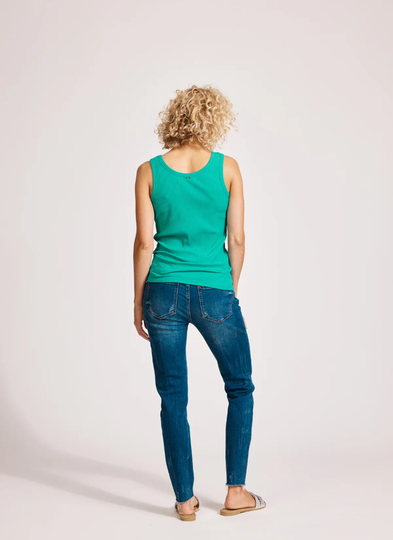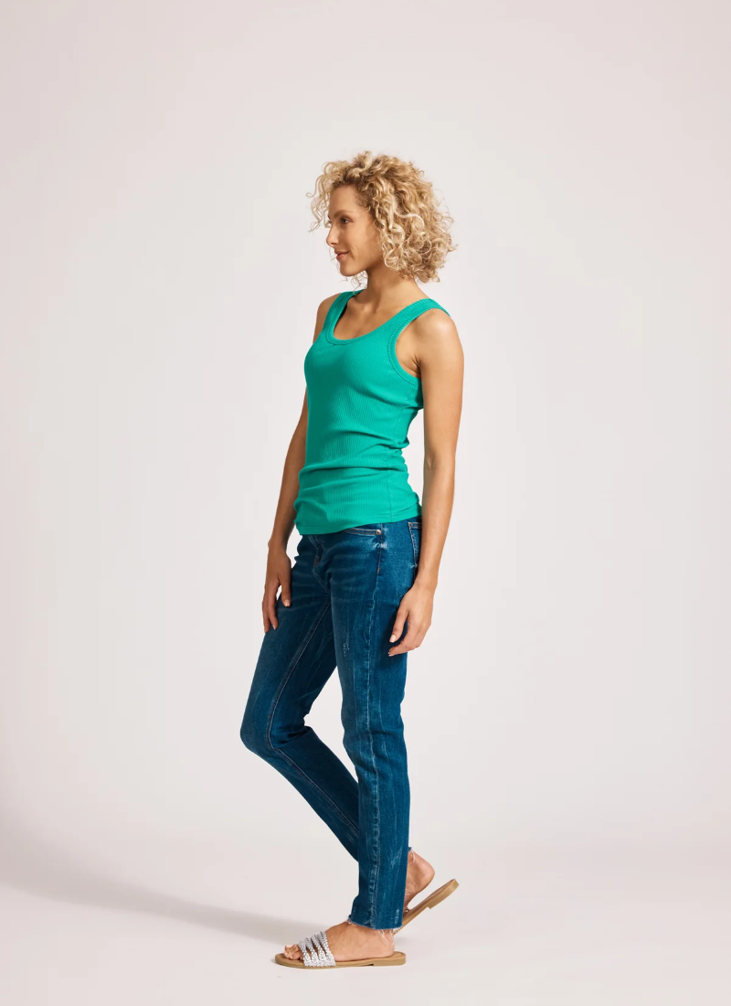 This tank features a flattering scoop neckline and a sleeveless design, crafted from soft ribbed fabric for added texture. A subtle brand logo is placed at the back of the neck, and the cotton-rich material ensures comfortable wear throughout the day