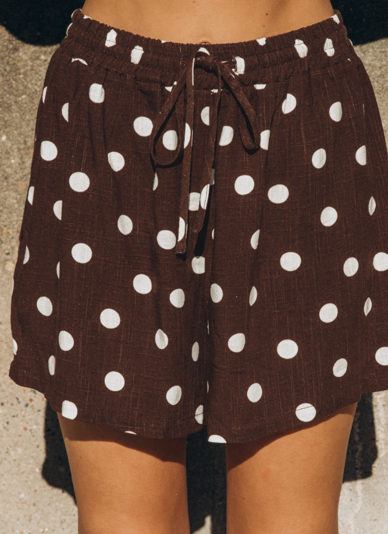 Introducing the Clarissa Top & Shorts set CHOC SPOT VVNE11148 from Ebby And I. This playful two-piece features a classic chocolate base with crisp white polka dots for an easy, polished summer look.