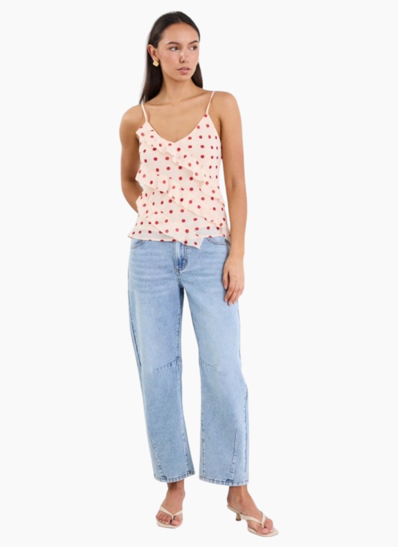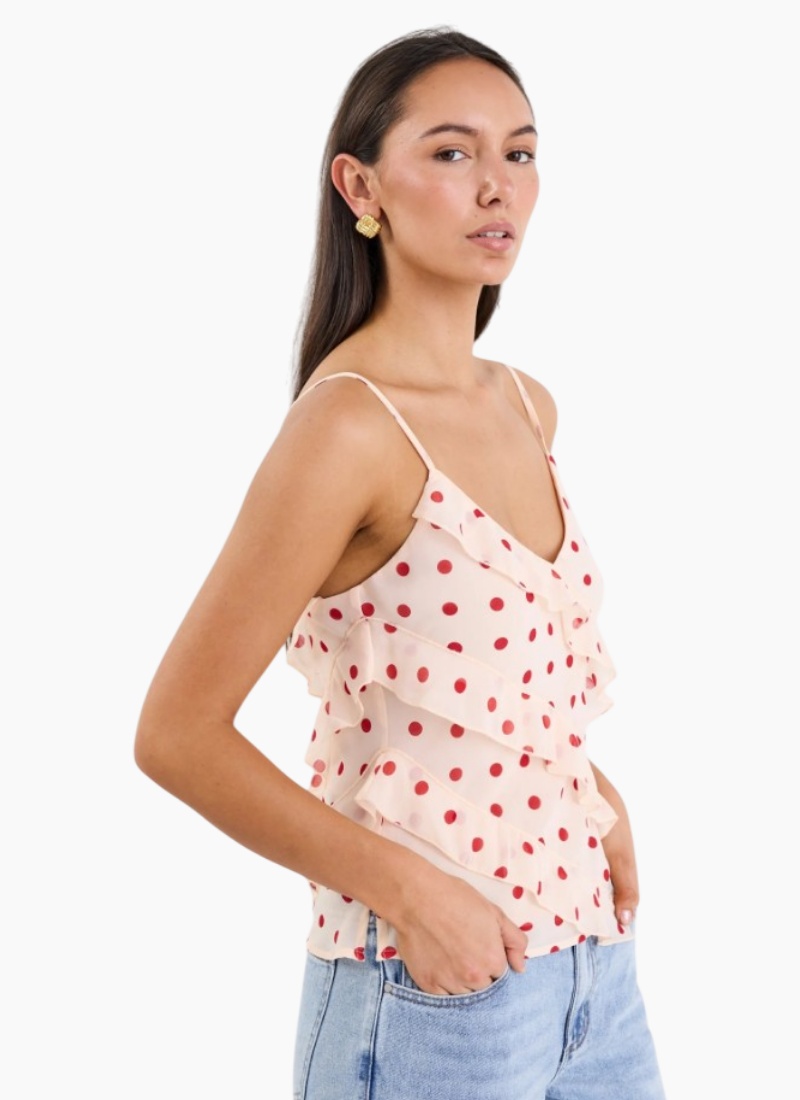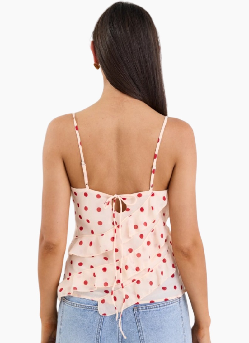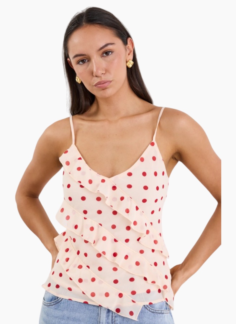 Playful and feminine, the Outgoing cream cherry polka dot frill front cami top from Georgia Mae brings a dose of vintage-inspired charm to your everyday style. The soft cream base is sprinkled with bold cherry-red polka dots, while cascading frills add movement and a touch of whimsy. Lightweight and silky, it’s the kind of top that instantly brightens your mood. This cami pairs beautifully with denim for casual days or can be dressed up with a sleek skirt and heels for a more refined look.