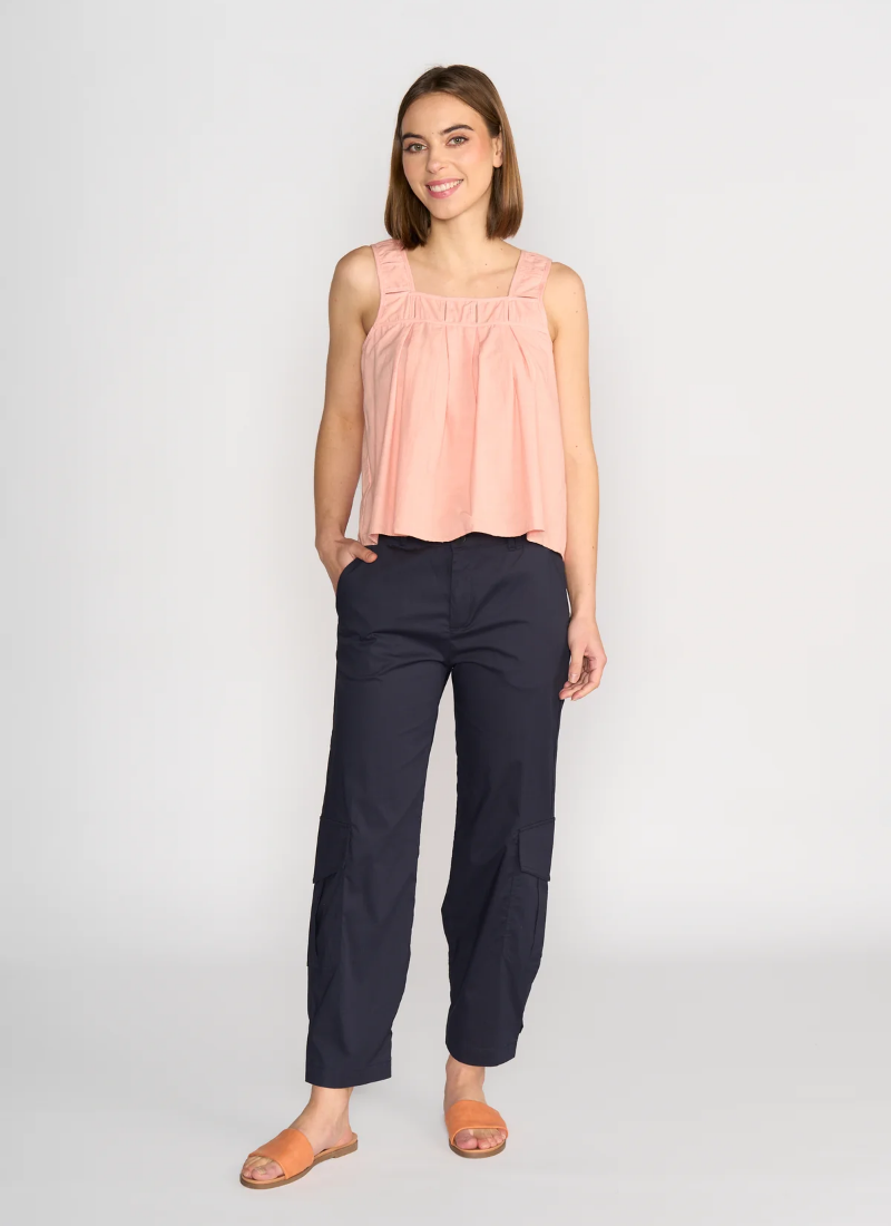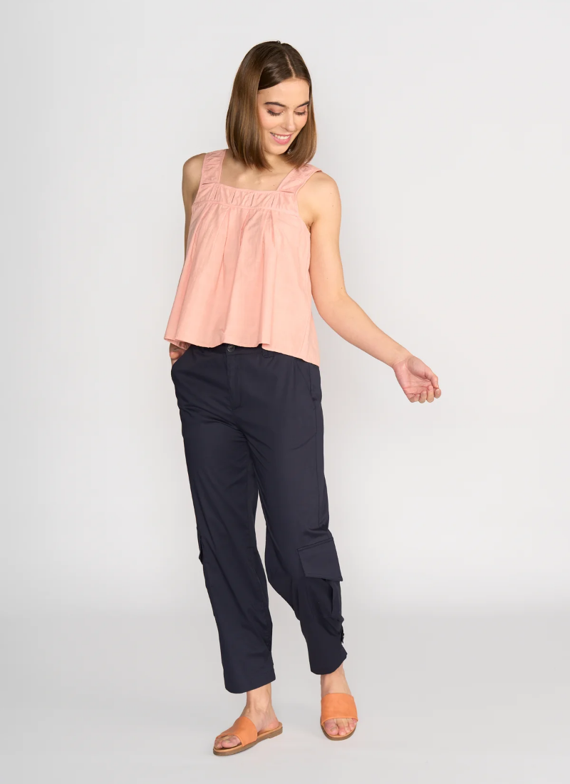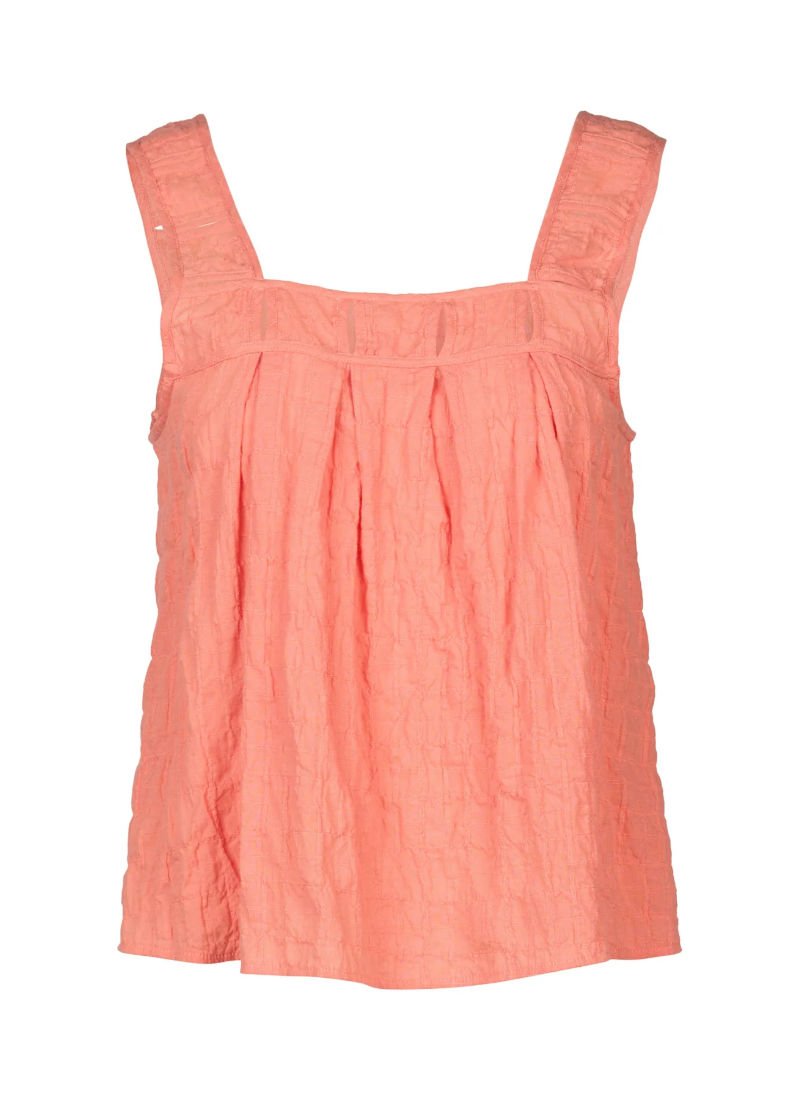 Made from lightweight cotton with a subtle checkered texture, this sleeveless top features wide straps and a squared neckline. Delicate partial pin tucks along the front and back create gentle dips that add soft shaping while keeping the fabric light and floaty. Designed with a relaxed fit for effortless summer style.