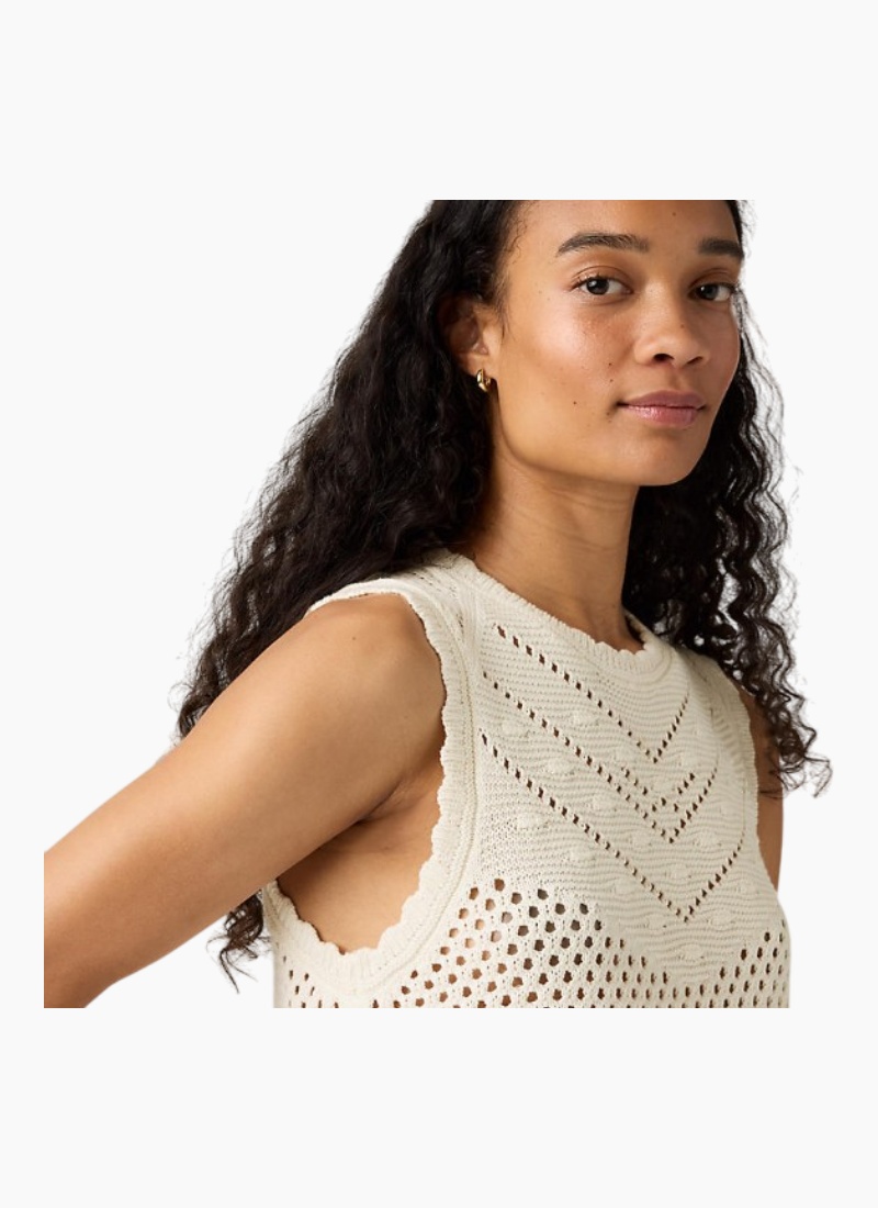 - Openwork crochet stitch offers an airy, textured silhouette ideal for layering or wearing solo