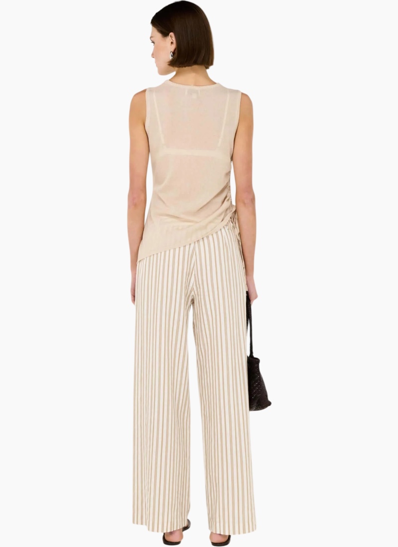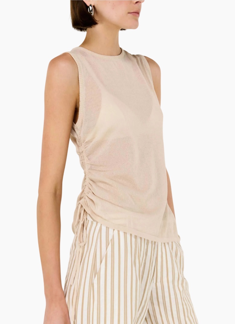 The Alix Sheer Drawstring Knit Tank Top is a refined, lightweight layer designed for modern, everyday wear. Crafted from a soft viscose blend, it features a sleeveless silhouette with adjustable side drawstring detailing that creates a flattering, softly ruched shape.