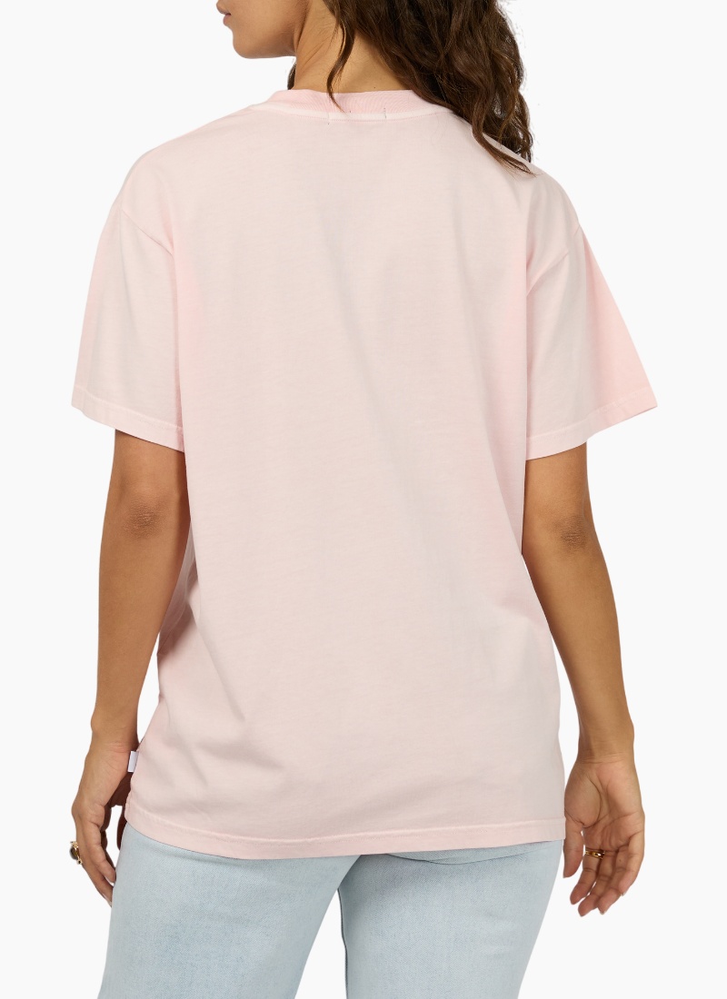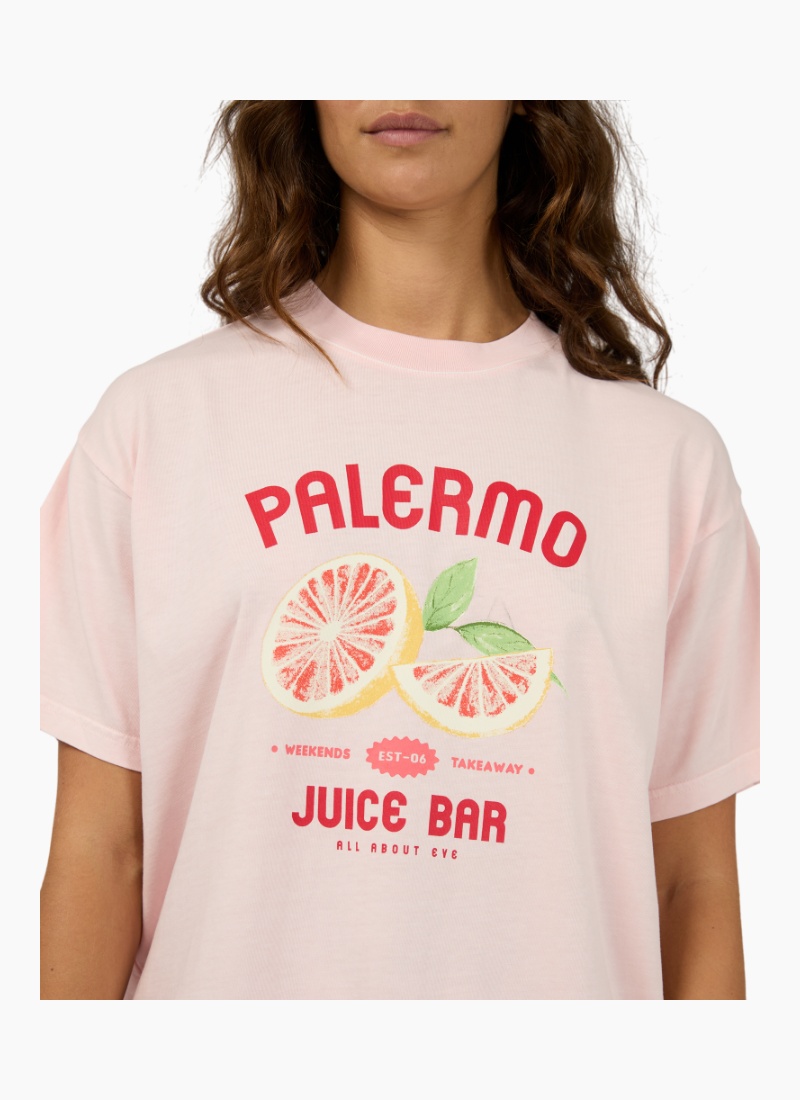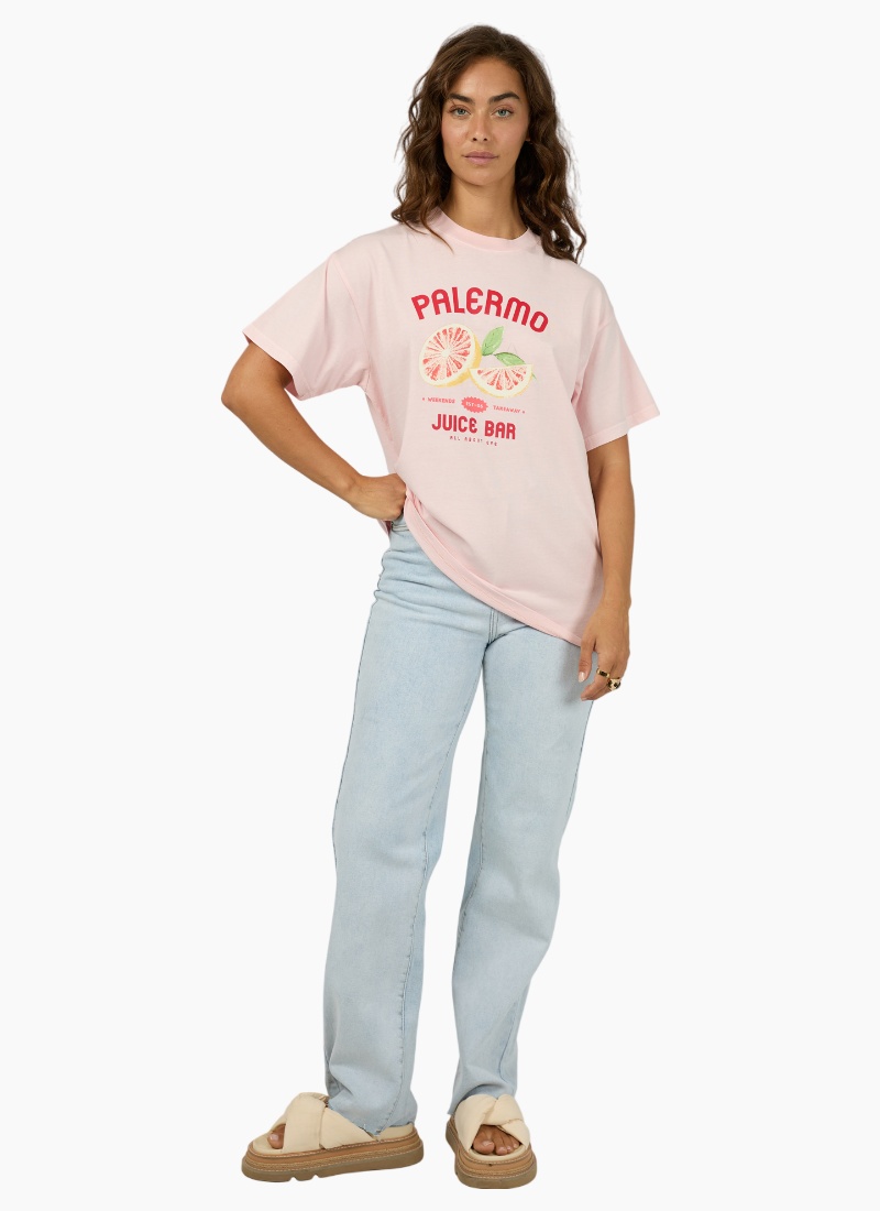 The Palermo Relaxed Tee brings a bold twist to everyday wear with its pink base and striking red text, finished with a playful grapefruit graphic for a fresh, zesty vibe. Its relaxed fit and soft cotton fabric make it a go-to for effortless style. Pair with denim or wide-leg pants for an easy, standout look.Relaxed Fit Crew Neckline Fruit Graphic 100% Cotton Model is wearing a size 8