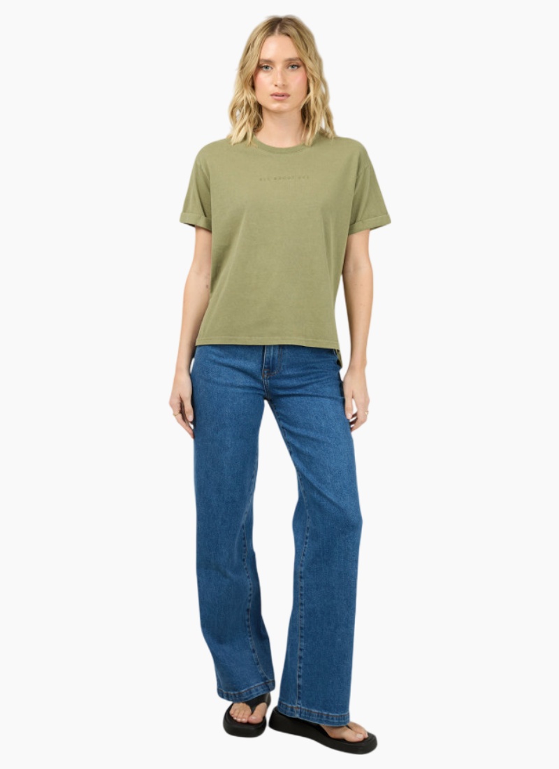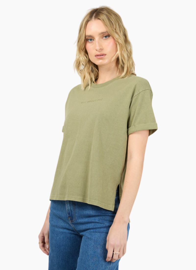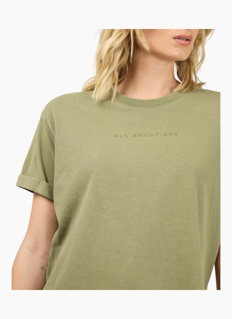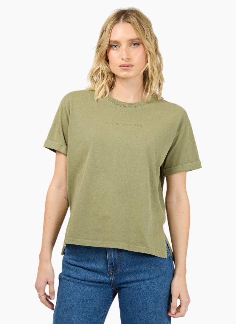 All About Eve Washed Tee features a garment wash with a branded chest embroidery. Styled back with denim jeans and sneakers for a chic weekend vibe.Rolled sleeve cuffs Regular fit Chest embroidery Model is wearing a size 8