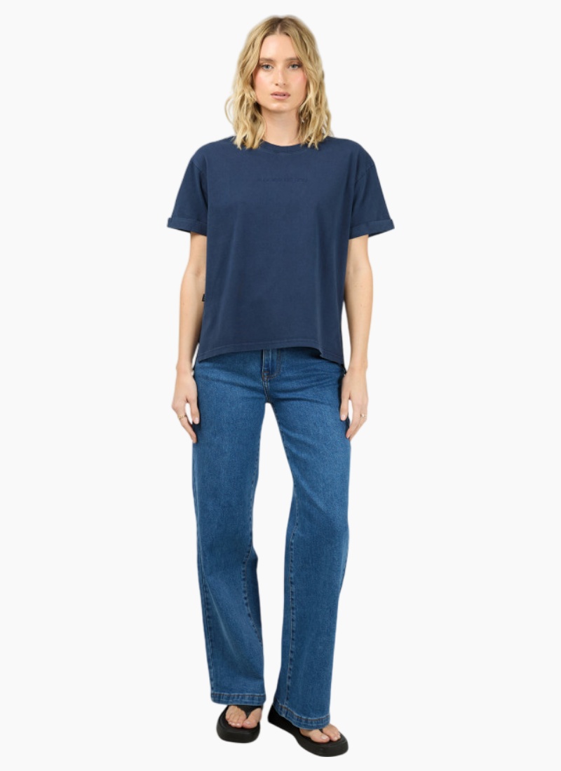 All About Eve Washed Tee features a garment wash with a branded chest embroidery. Styled back with denim jeans and sneakers for a chic weekend vibe.Rolled sleeve cuffs Regular fit Chest embroidery Model is wearing a size 8