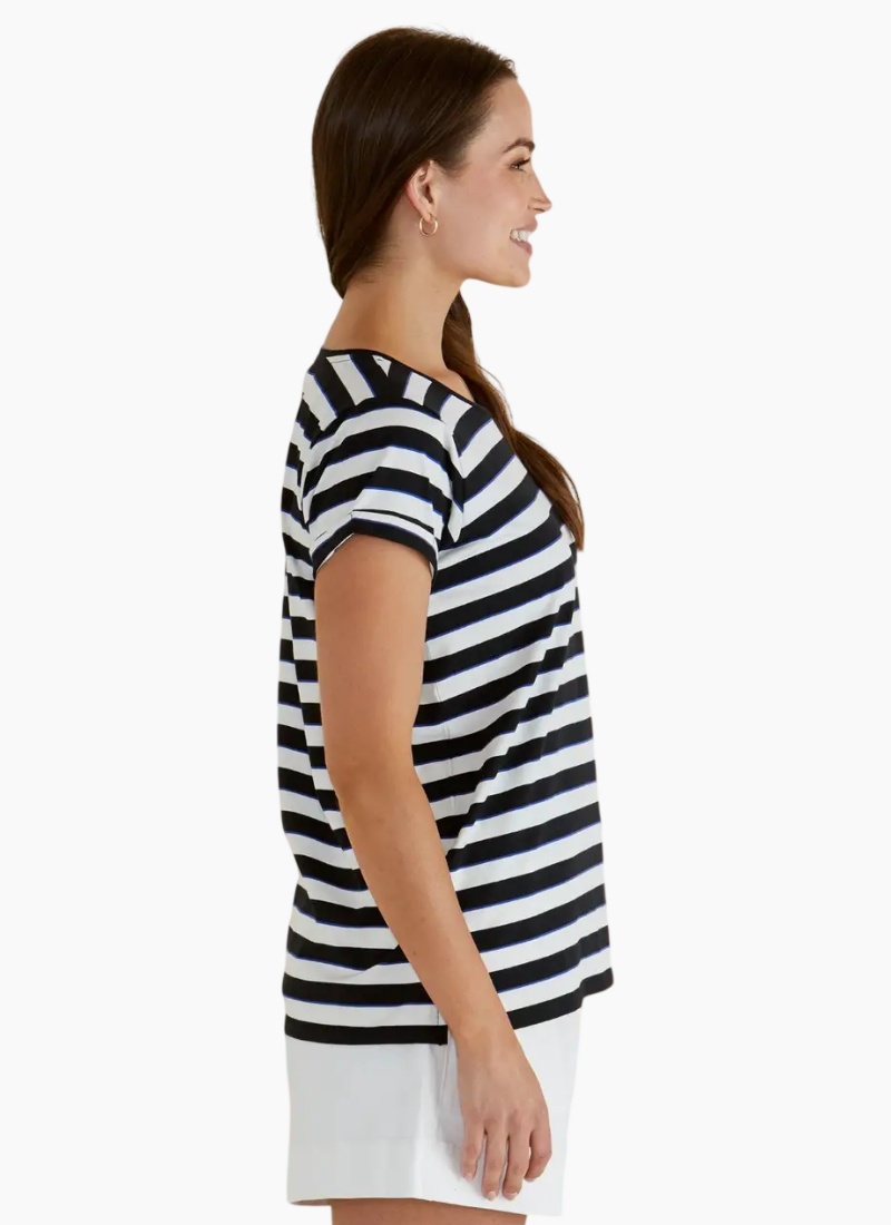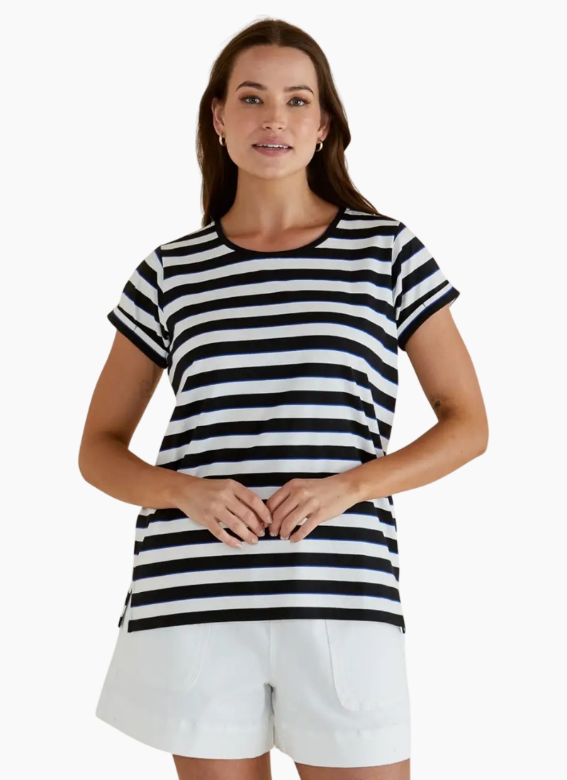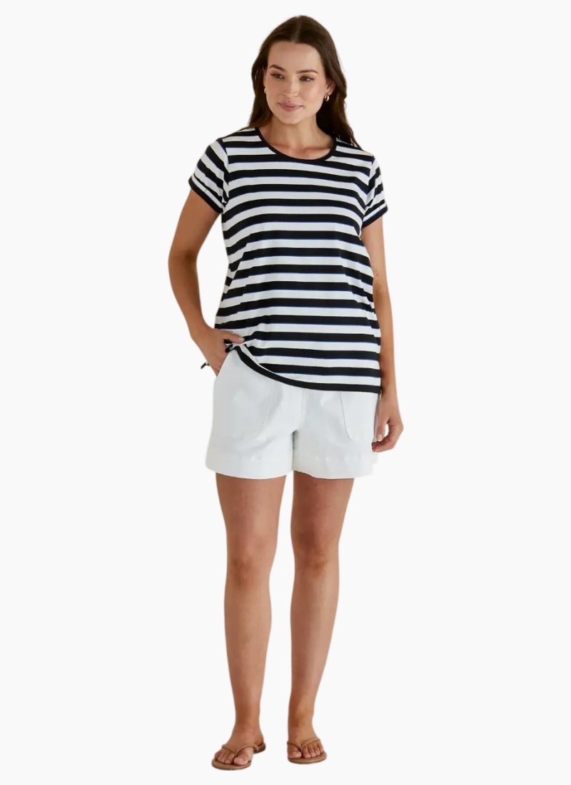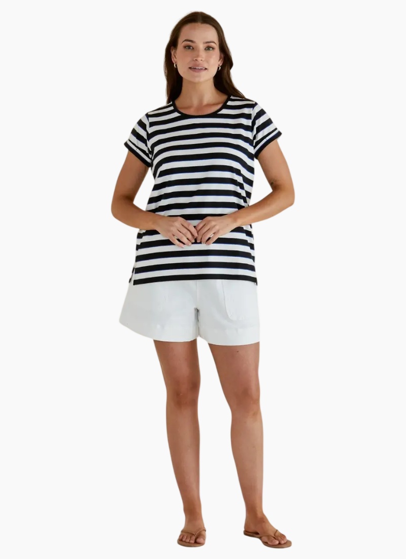 Introducing the Caia Crew Tee from Betty Basics. A timeless striped tee that elevates everyday dressing.