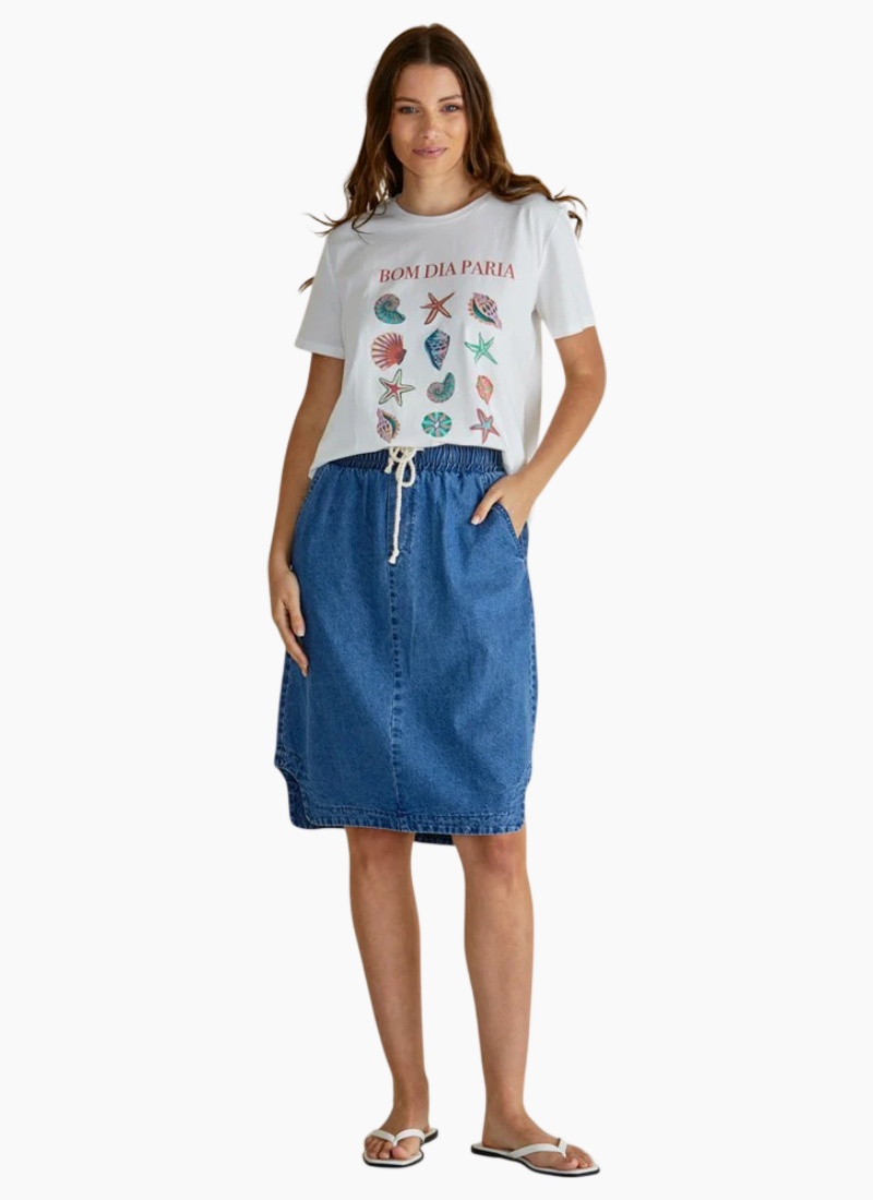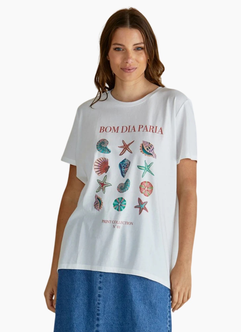 Introducing the Ellia Crew Tee from Betty Basics. A relaxed, coastal-inspired white tee with a playful shell print that lifts everyday dressing.