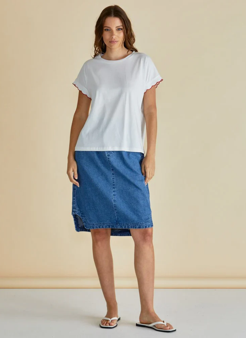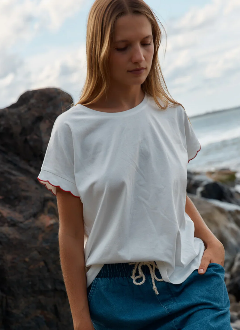 The Sloane Scallop Tee brings a feminine touch to a classic silhouette. Crafted from soft cotton slub jersey, it features a round neckline and delicate scallop trim sleeves. The straight hem and relaxed fit make it an effortless choice for everyday wear. Comfortable, elevated, and transeasonal by design.