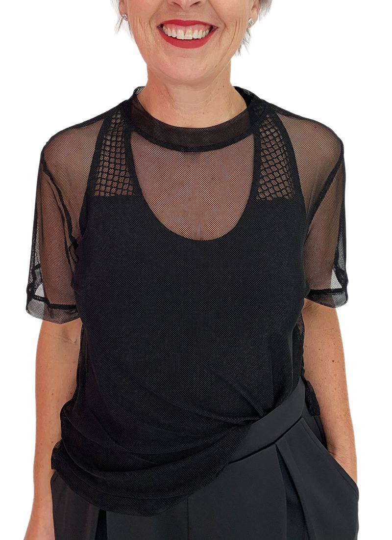 Don’t miss this staple piece in your closet this summer! A fine and sophisticated stretch net – featuring a finished hemline detail and a high to low bottom hemline with a side cut for tucking.
