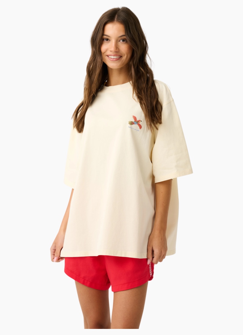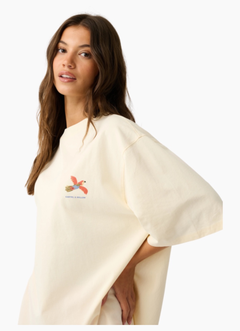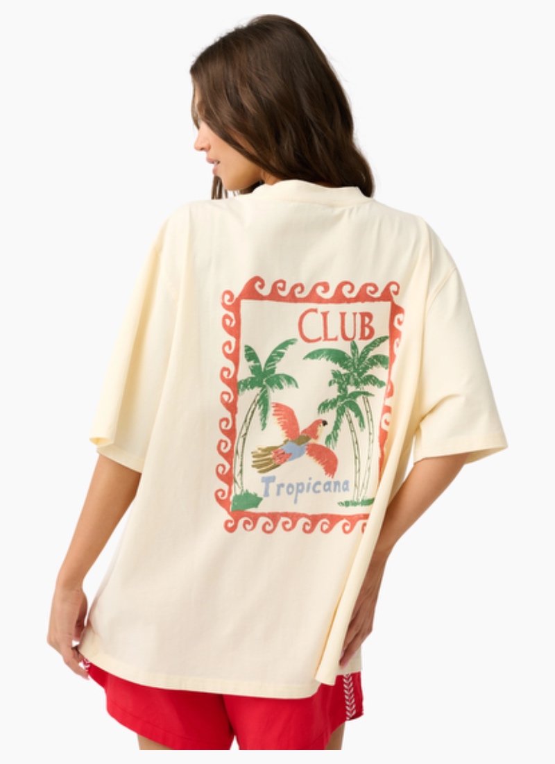 Introducing the Jeana Tee Tropicana from Cartel & Willow. This cream cotton tee brings a relaxed, holiday-ready vibe with a vintage-inspired tropical back print.