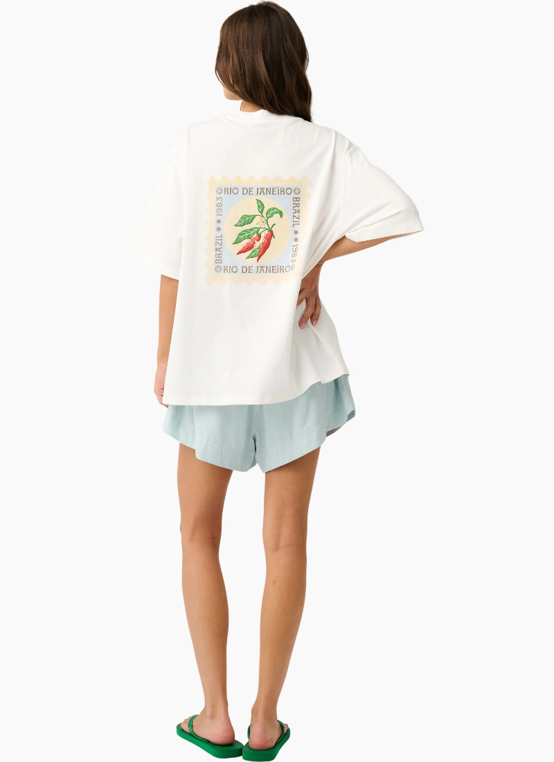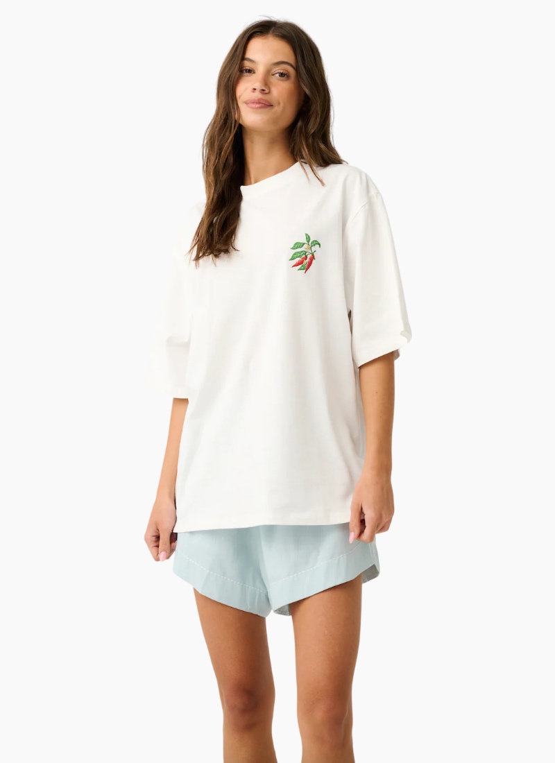 Boxy-fit T-Shirt Short Sleeve Straight hemline Small chilli graphic on the front chest Large chilli stamp graphic across the back 100% Cotton Jersey Fabric Grace is 173 cm and wears a size small Hotel De La Palm Resort 2026 collection