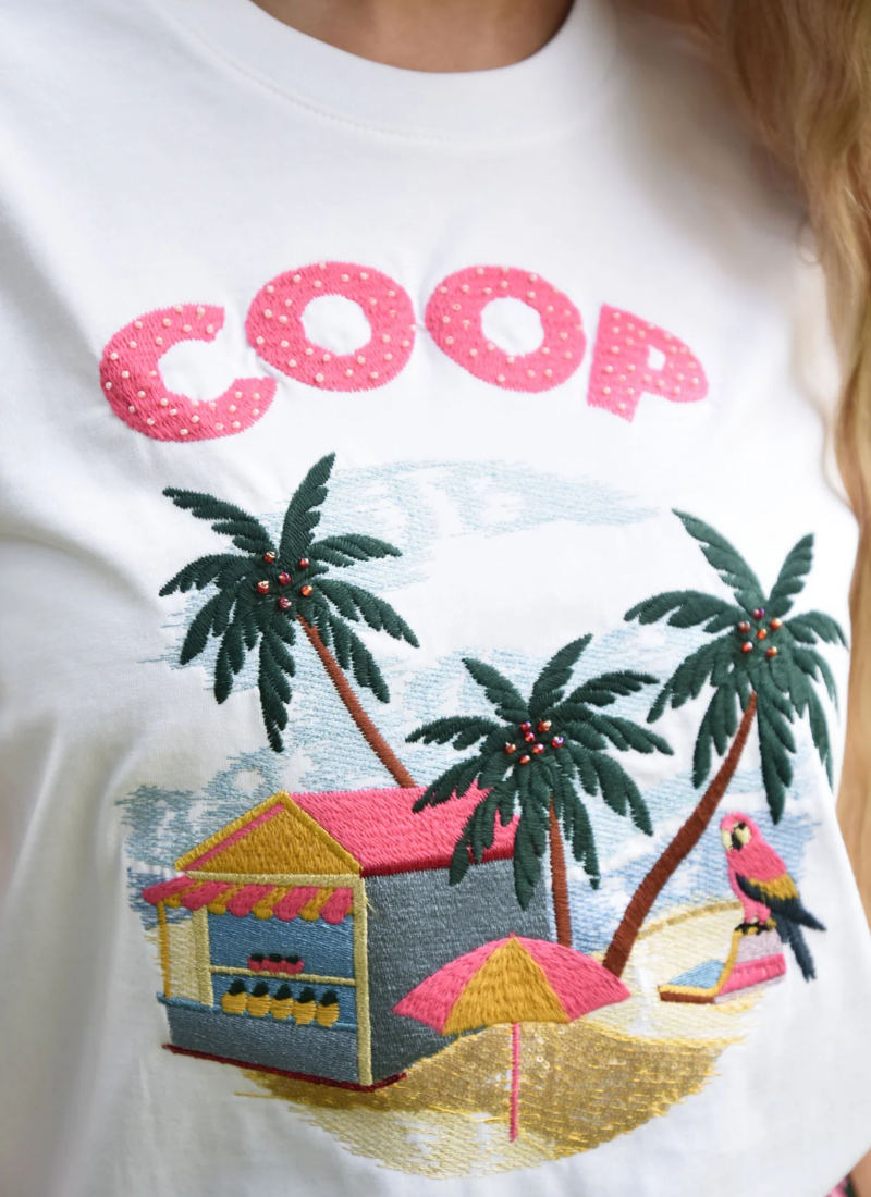 - Embroidered beach scene and pink COOP lettering add texture and a pop of colour