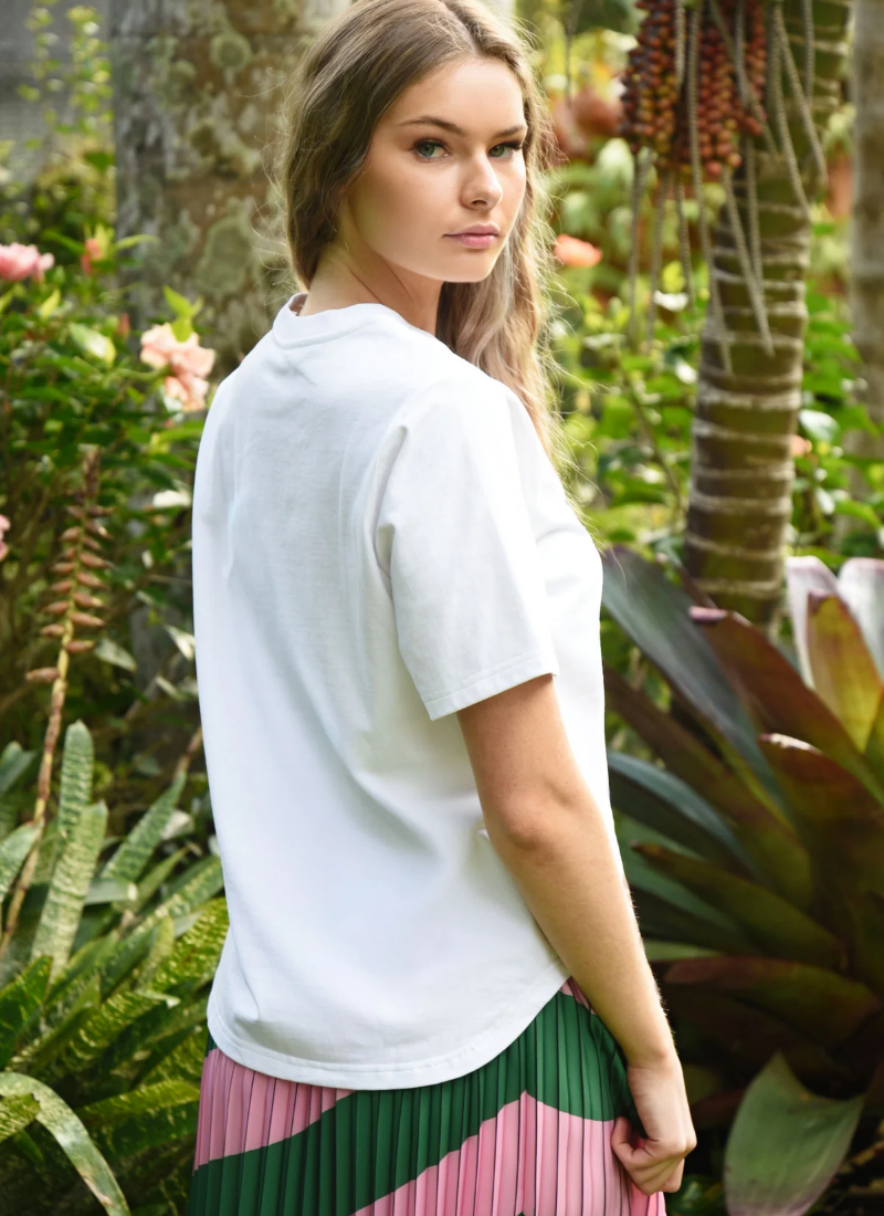- Pink/White from COOP. This relaxed white tee is finished with a playful pink logo and embroidered tropical beach motif for an effortless summer-ready look.