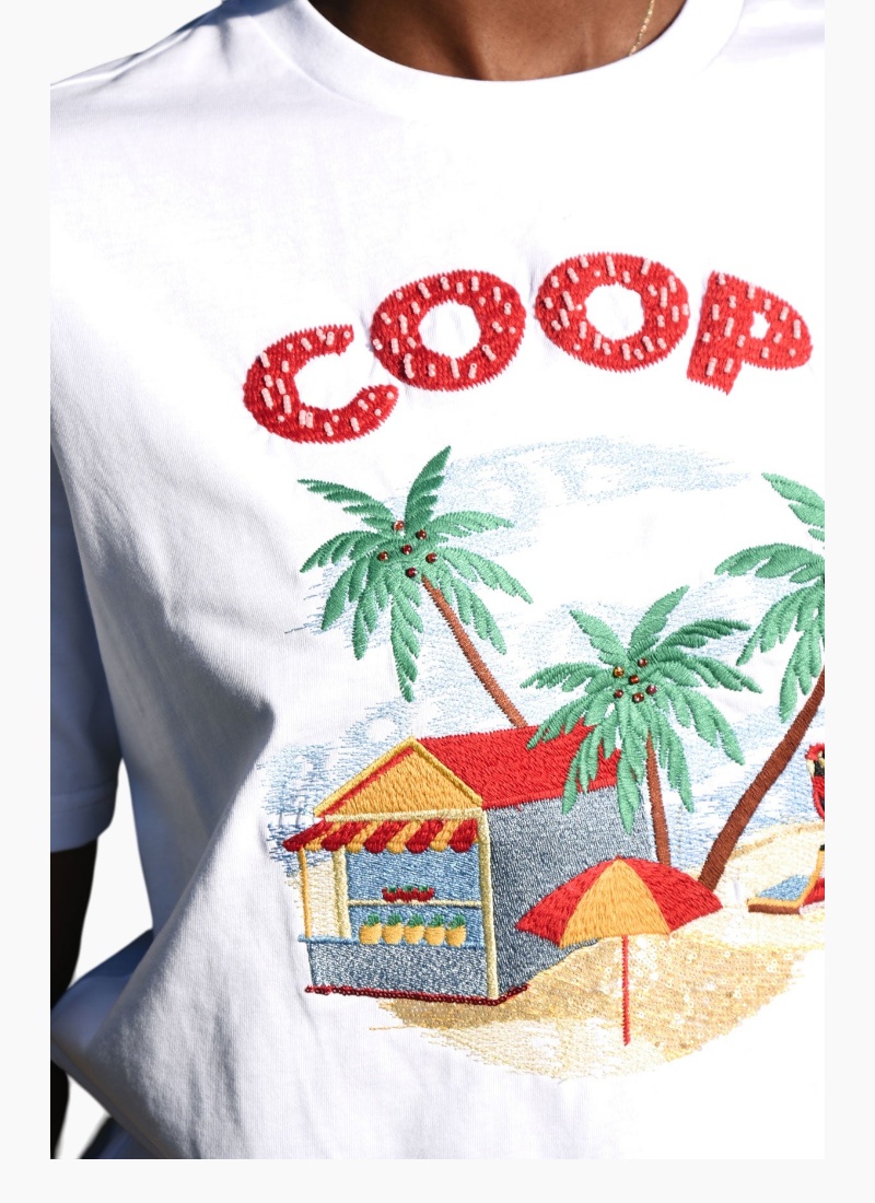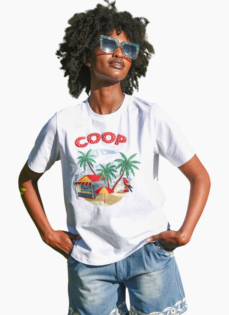 - Crisp white colour with a vibrant beach graphic and COOP logo for a playful statement
