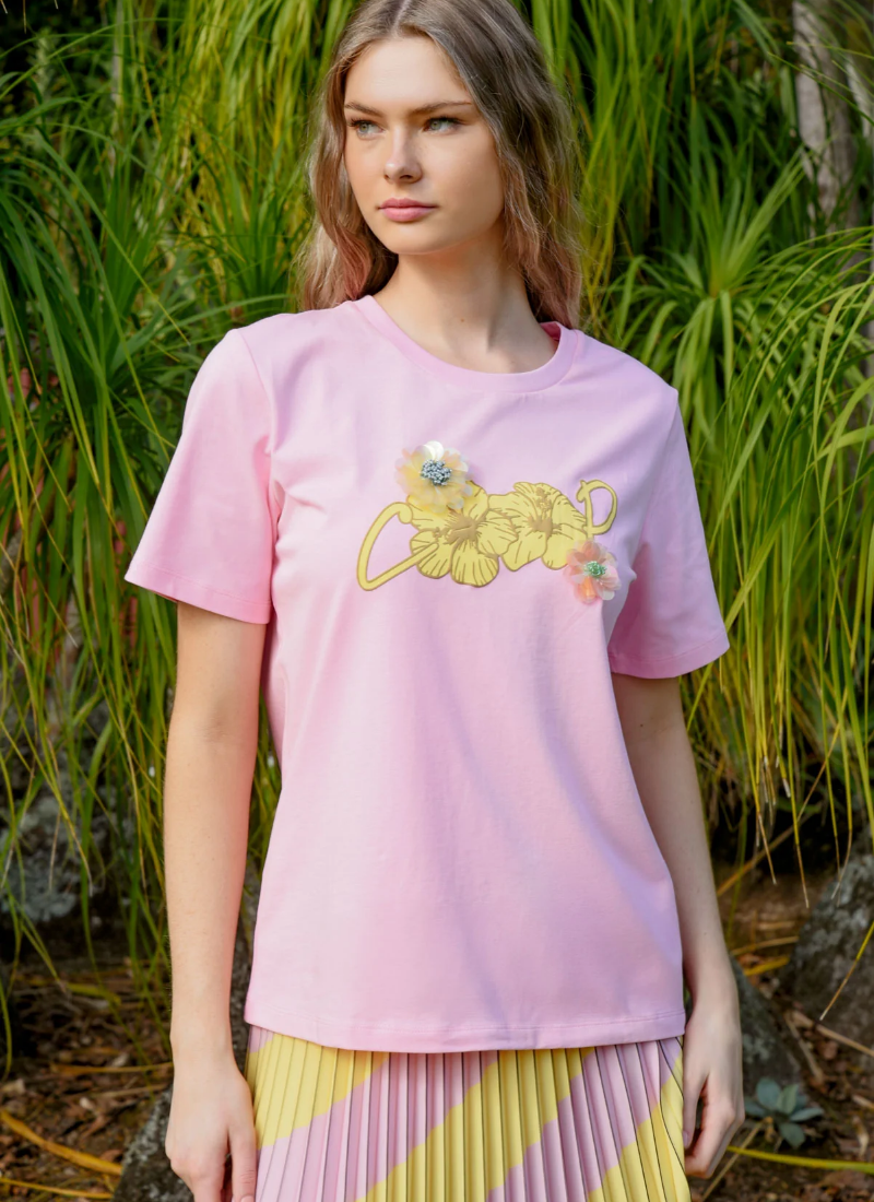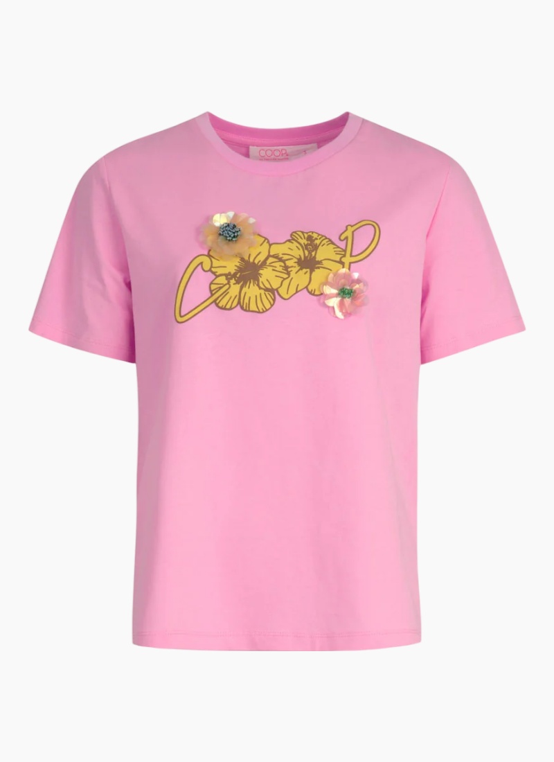 Introducing the Hibiscus Holiday T-Shirt from COOP. This playful pink tee brings tropical charm to everyday dressing with hibiscus artwork and delicate 3D floral embellishments.