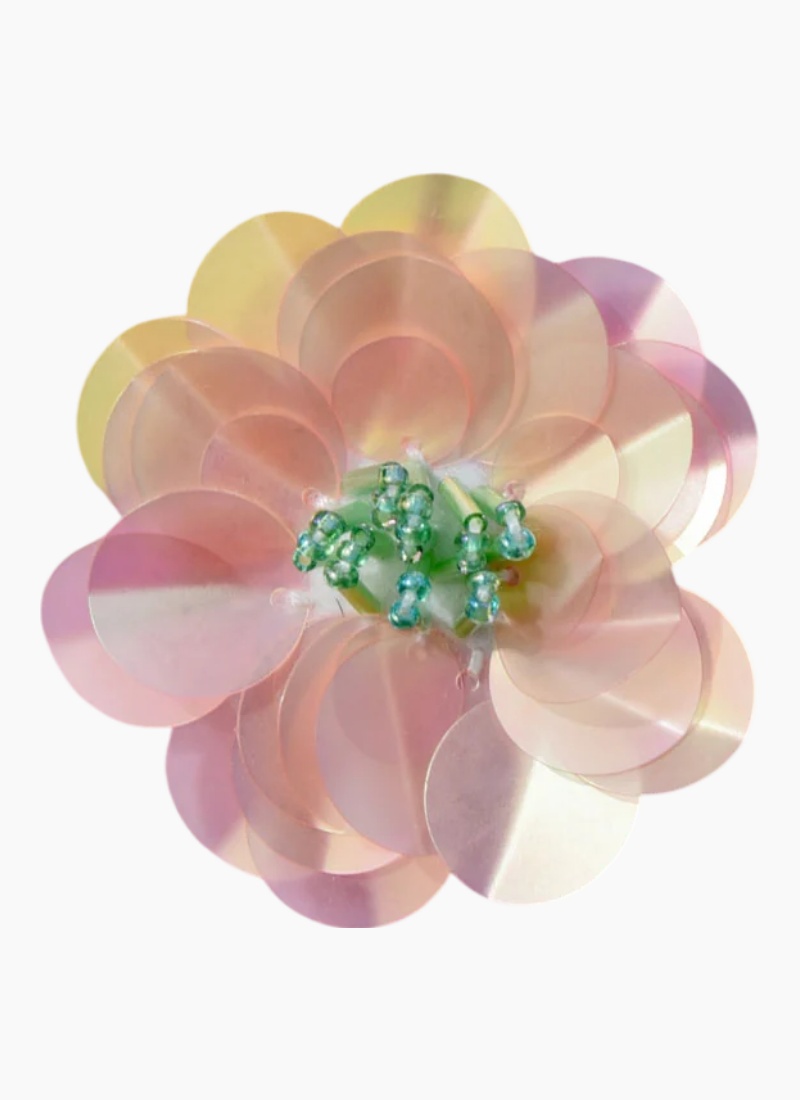 - Embellished hibiscus print and appliqué flowers add a feminine, holiday-ready detail