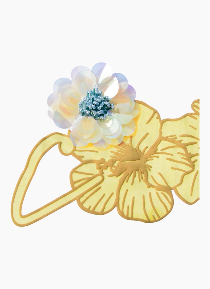 - Features a cheerful hibiscus print with delicate 3D floral appliqués that lift the design