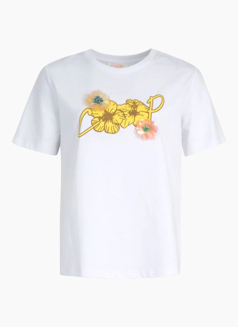 Introducing the Hibiscus Holiday T-Shirt from COOP. This white tee combines playful floral detail with relaxed, everyday polish.