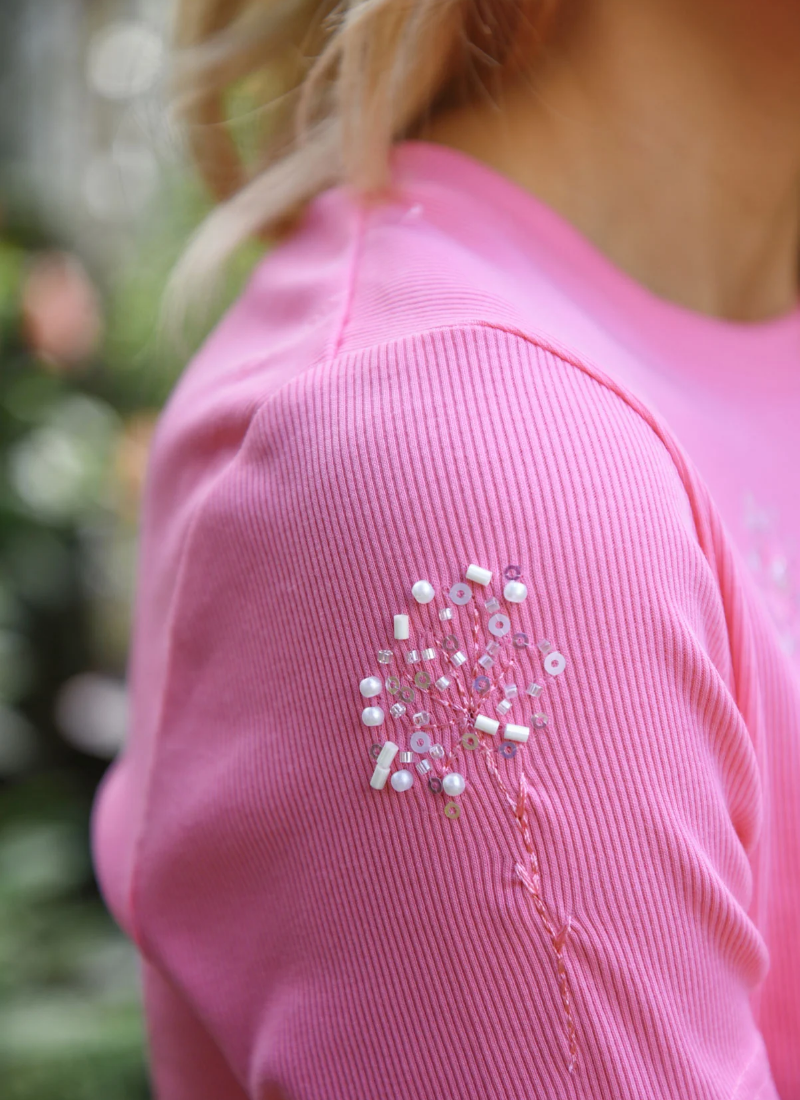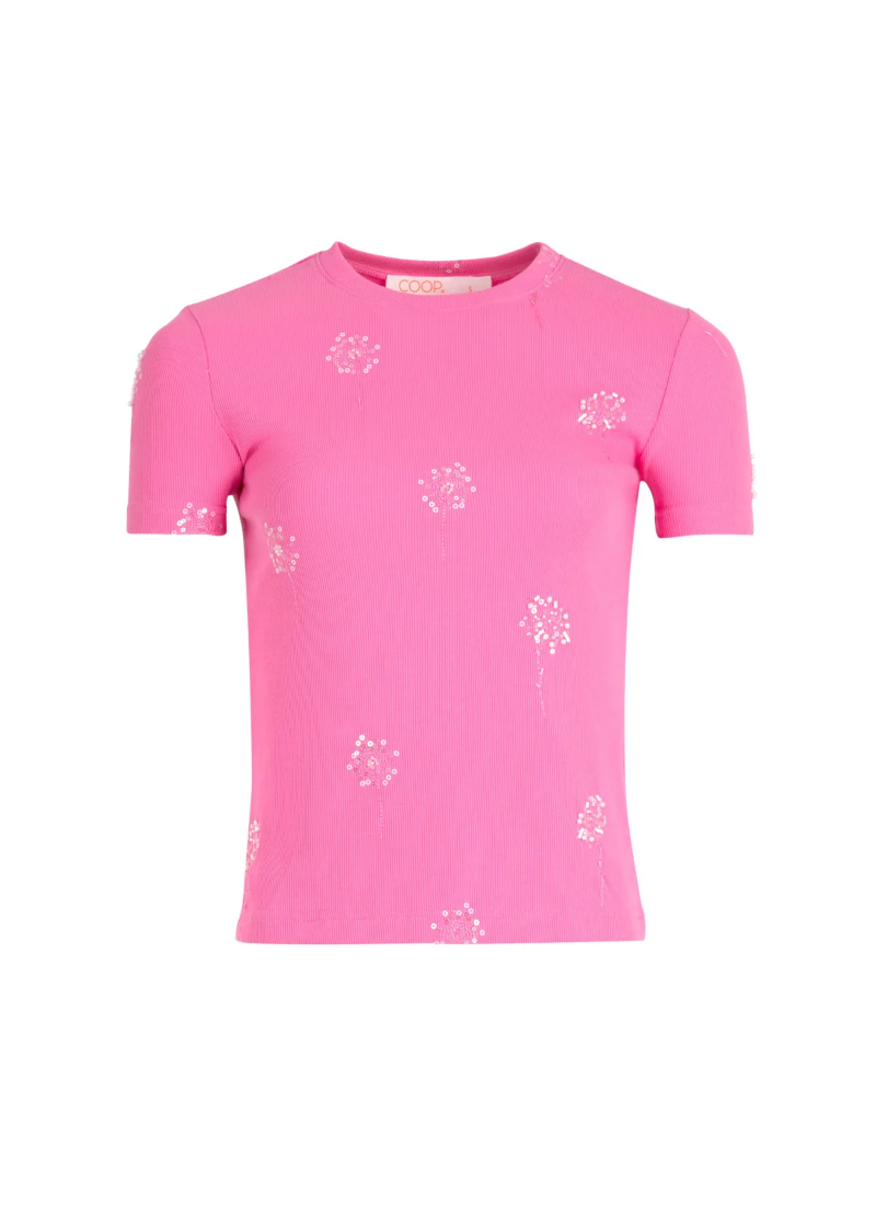 - Short-sleeve fashion tee in a vibrant pink colour with scattered sequin dandelions that catch the light