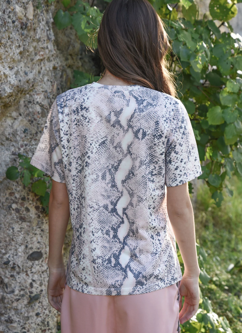 - A Tees piece in a delicate pink colour with monochrome snake-print accents and branded front detail