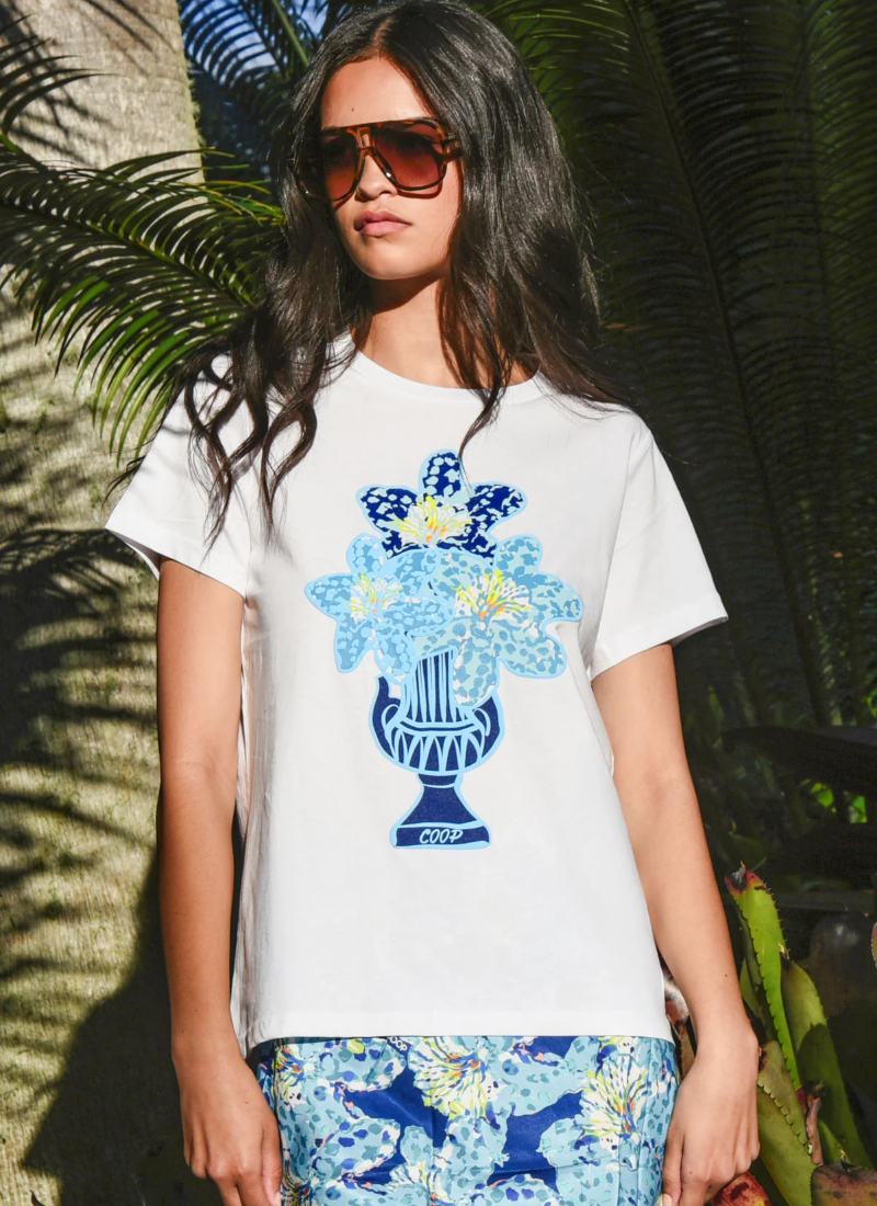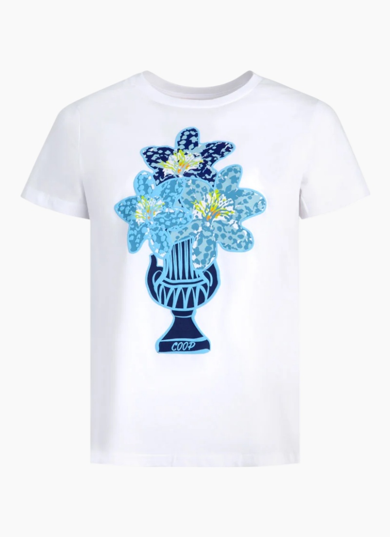 - White/Blue from COOP. This crisp white tee is elevated by a painterly blue vase and floral graphic for an artful, modern look.