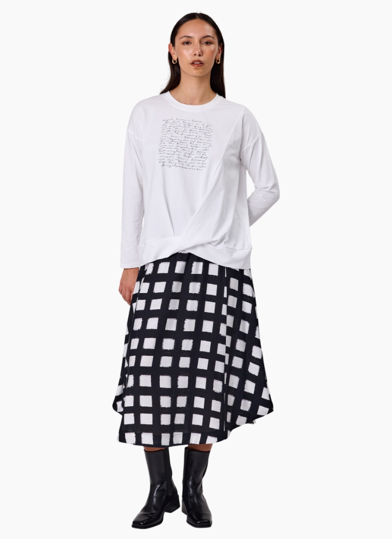 Introducing the Prism Long Slv Tee from Duo. A crisp white tee that blends everyday ease with considered detailing.