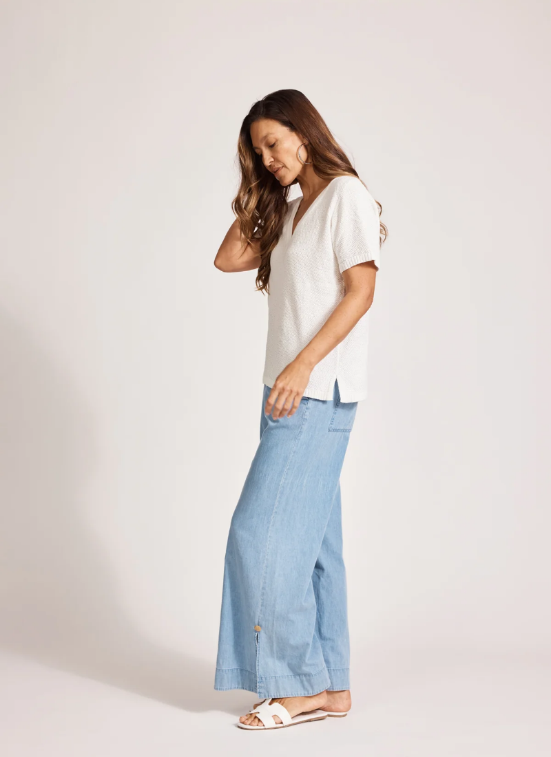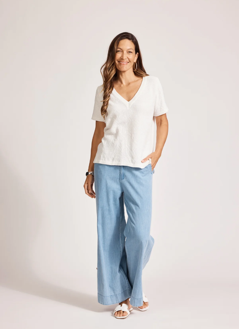 This white knit top features a flattering V-neckline and short sleeves for a comfortable fit. Crafted from 100% cotton waffle knit, it offers breathability and softness. The straight hem with side splits adds a stylish touch, making it a versatile addition to your wardrobe.