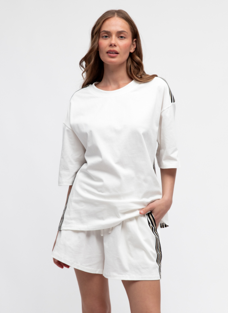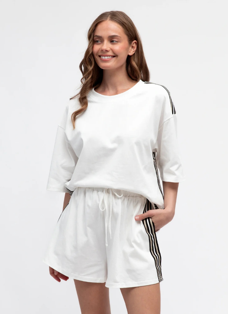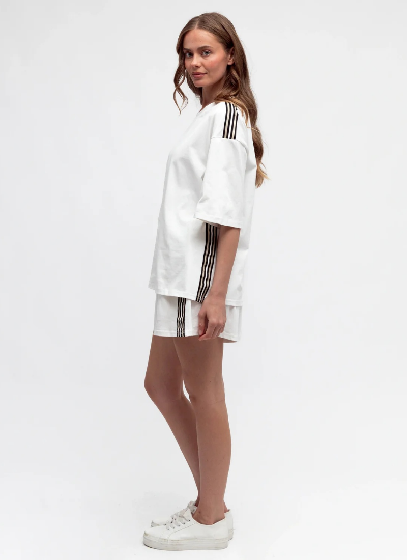 Introducing the Sport stripe Tee from Ebby And I. A relaxed white tee accented with contrasting black sport stripes on the shoulders and side seams, perfect for effortless everyday style.