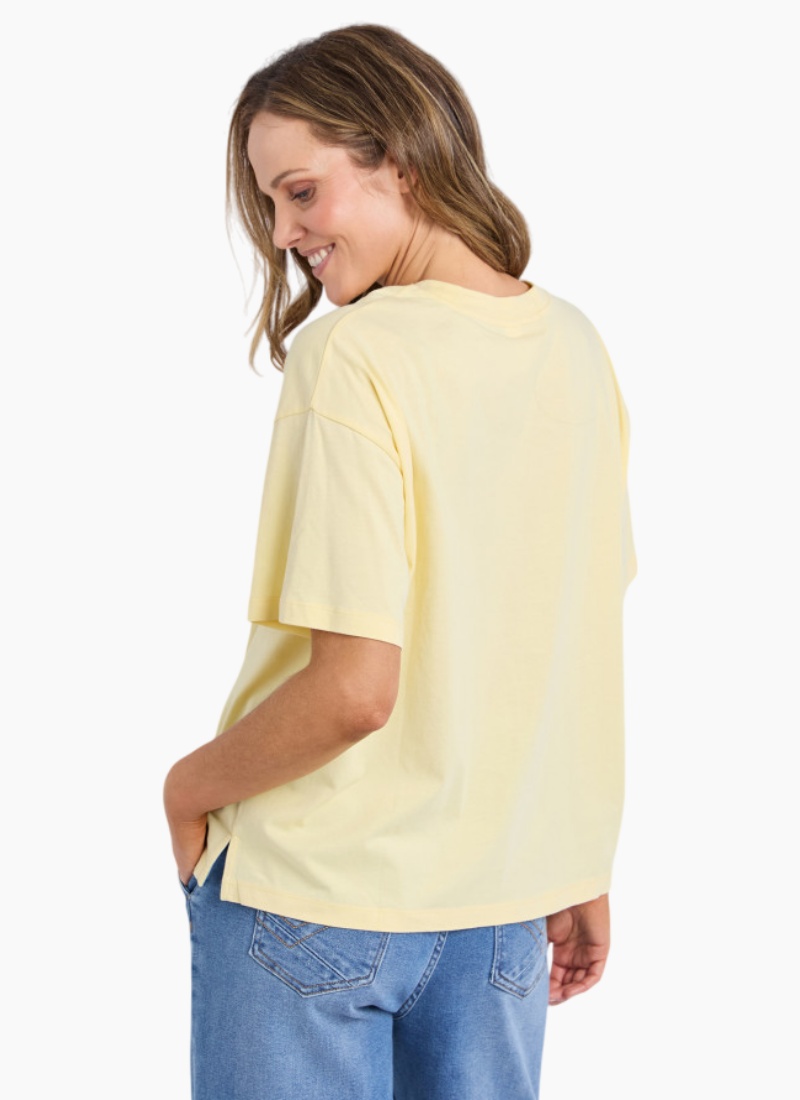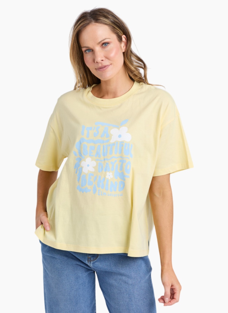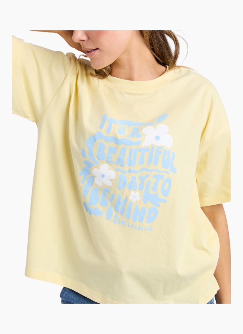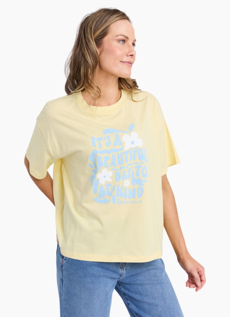 The Elm Beautiful Day Tee brings instant feel-good vibes. With its relaxed fit, soft cotton fabric, and playful front graphic, it’s the ultimate throw-on-and-go piece. Pair with denim or shorts for that carefree, sunny-day look that never goes out of style.Print on front Crew neck No pockets Stretch fabric Standard fit