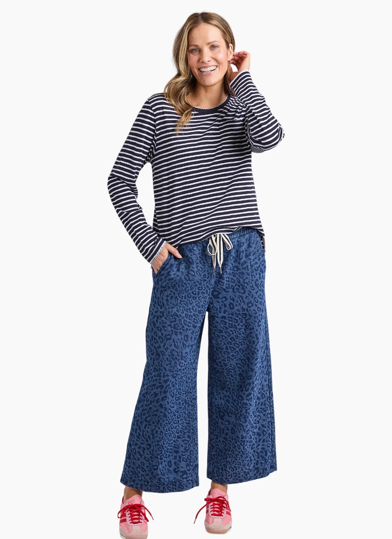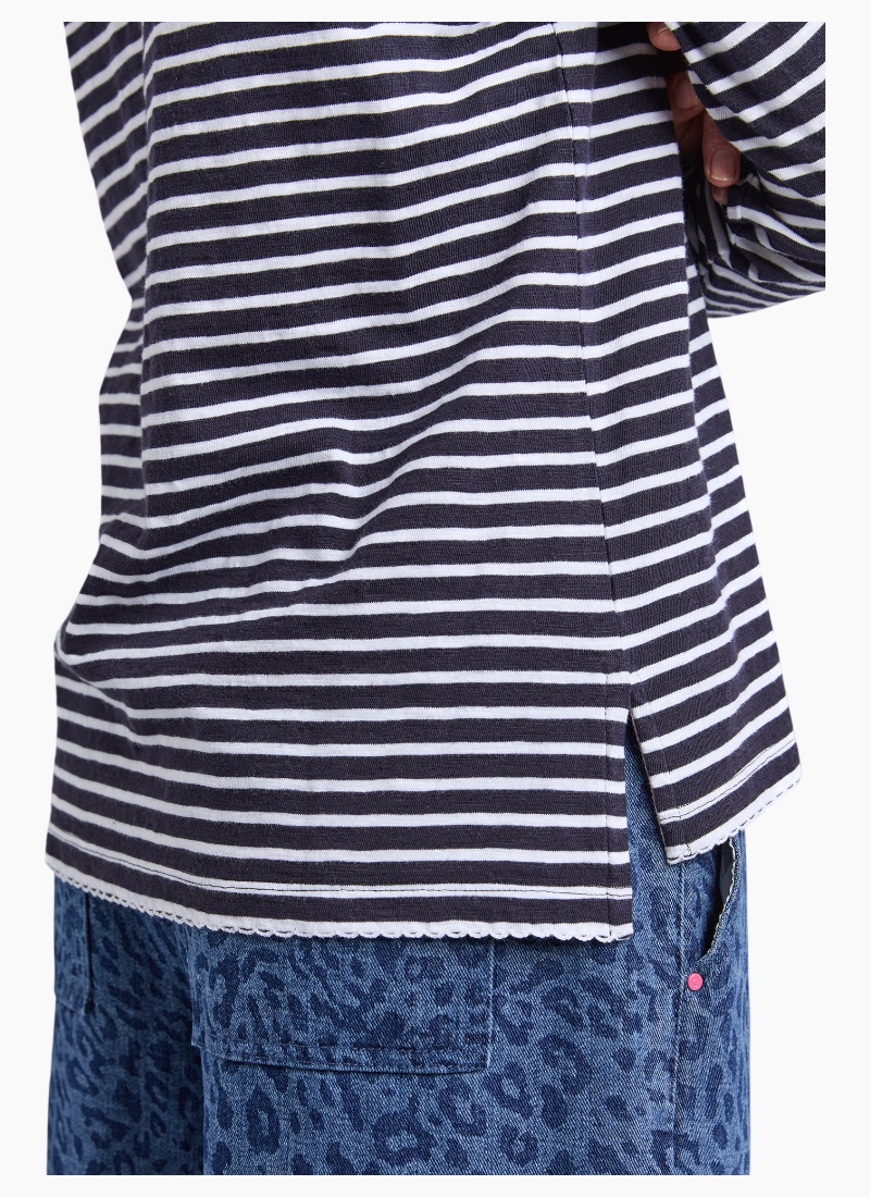 - Classic navy and white stripe with a delicate scalloped hem for a subtle feminine finish