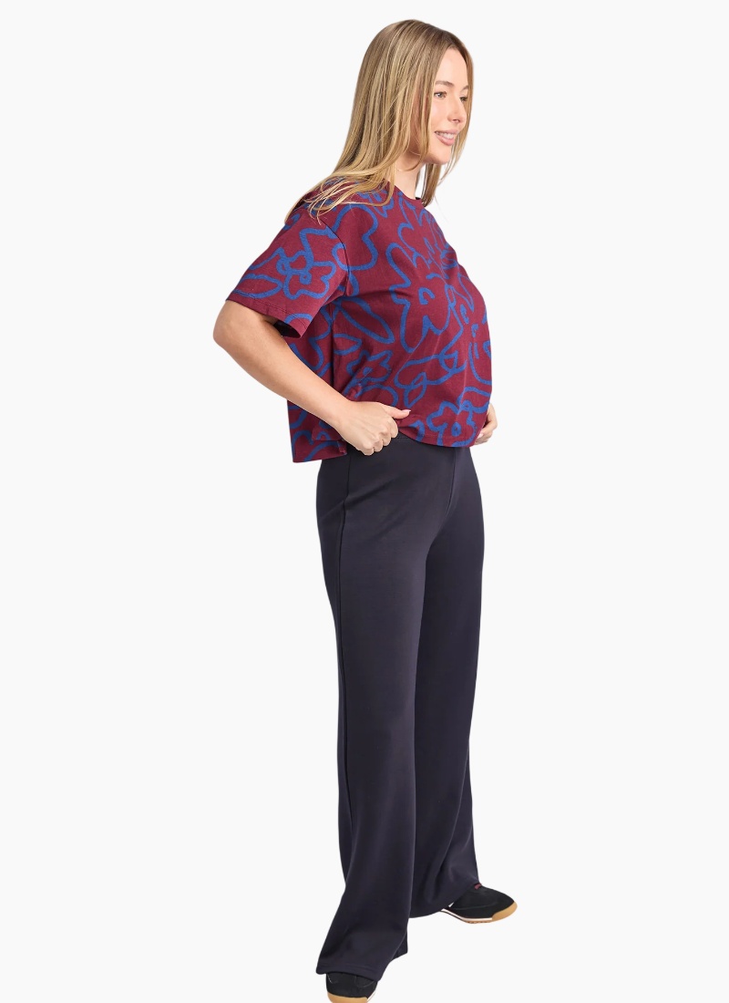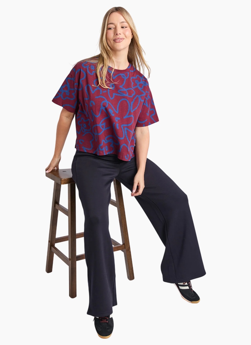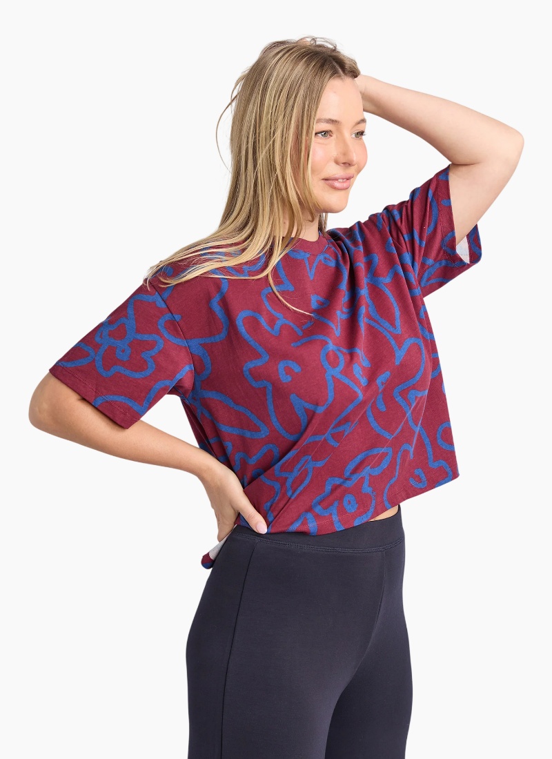 - Striking burgundy base with painterly cobalt-blue floral print delivers a bold colour statement