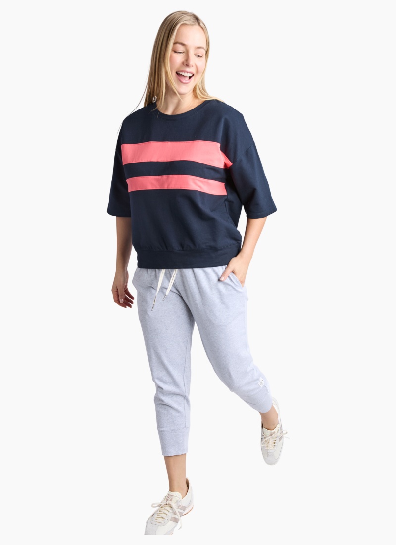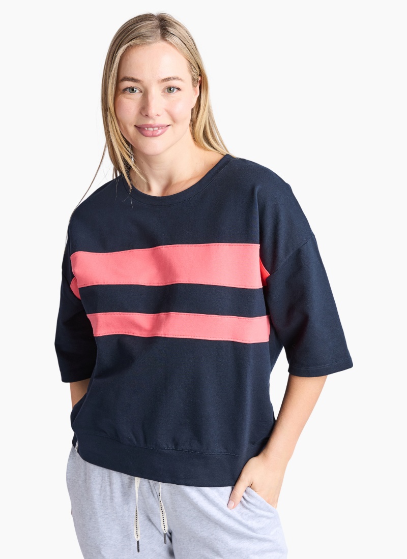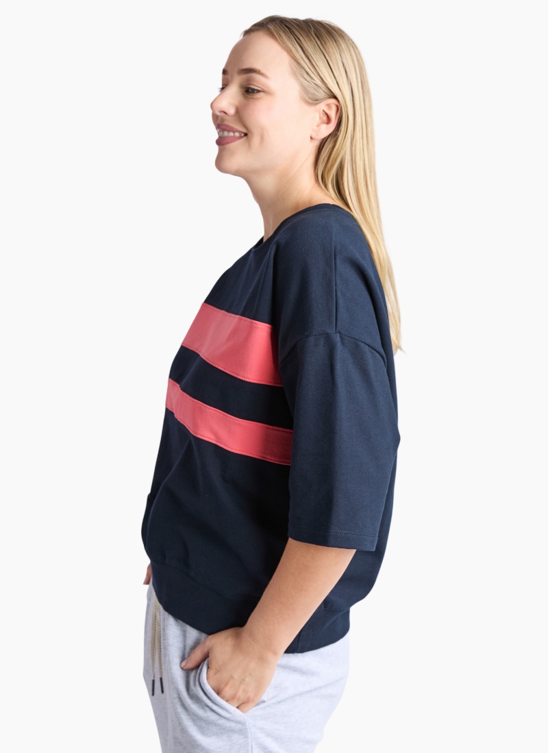 Introducing the Nico Sweat from Elm. This relaxed navy sweatshirt with bold coral-pink stripes offers effortless weekend style and everyday comfort.
