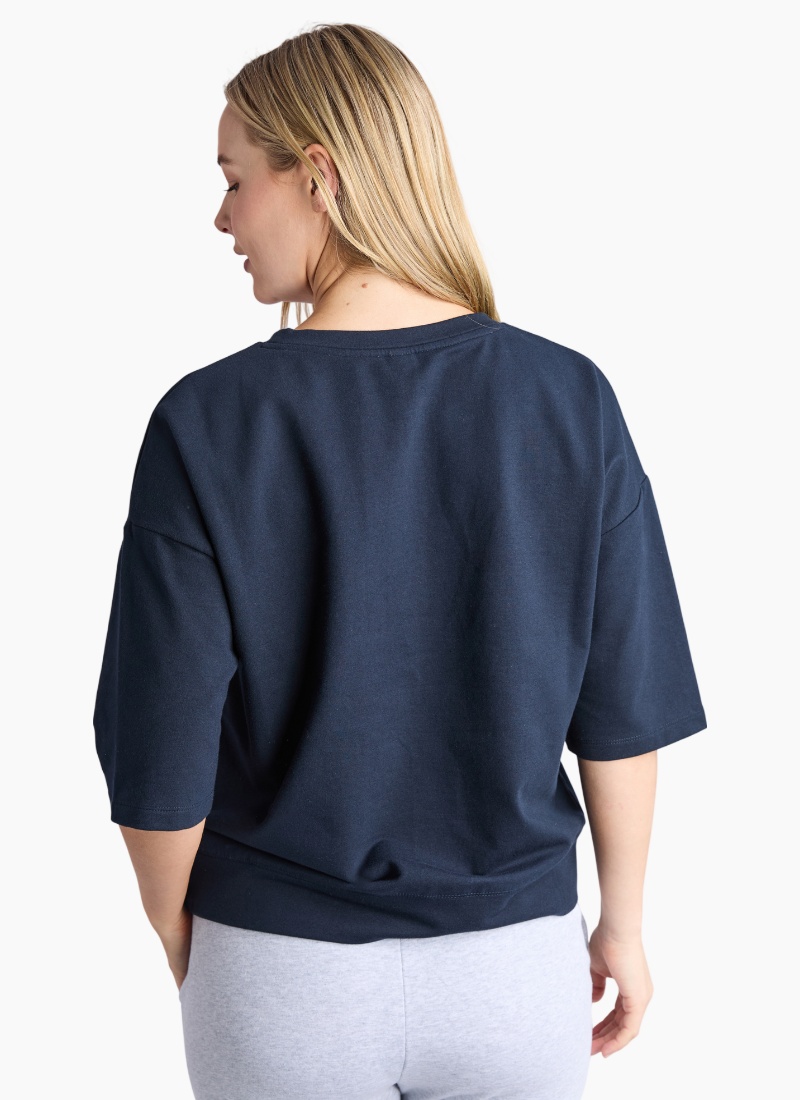 - Boxy, relaxed silhouette with dropped shoulders and elbow-length sleeves for an easy, modern look