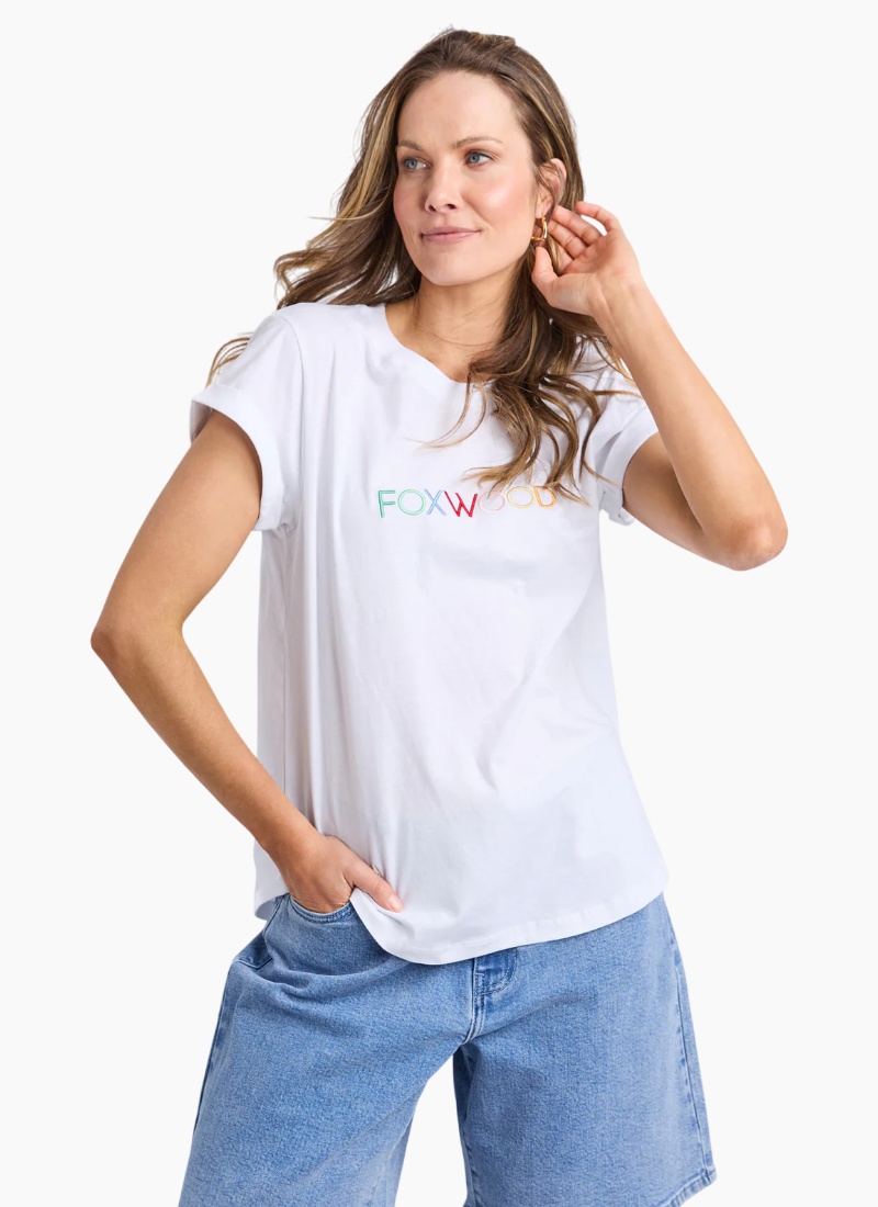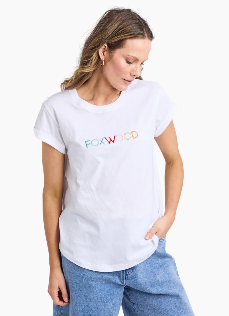 - Confetti Tee in white. This effortless wardrobe essential showcases playful multicolour embroidery on a crisp white tee.