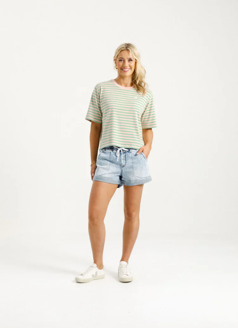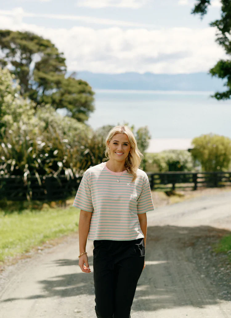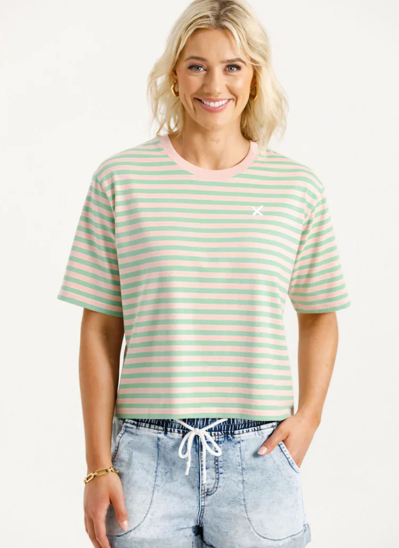The Becky Tee is a slightly cropped, easy-to-wear tee-shirt made from a stretchy Cotton/Elastane blend.Featuring our signature Candy Apple Stripe fabric and a subtle X on the front chest for that signature Homelee touch, it’s a comfortable and stylish addition to any wardrobe. Perfect for laid-back days with a pop of personality. See More Details below to find your perfect fit!