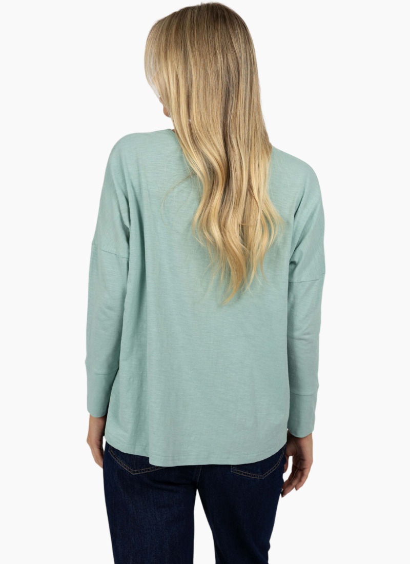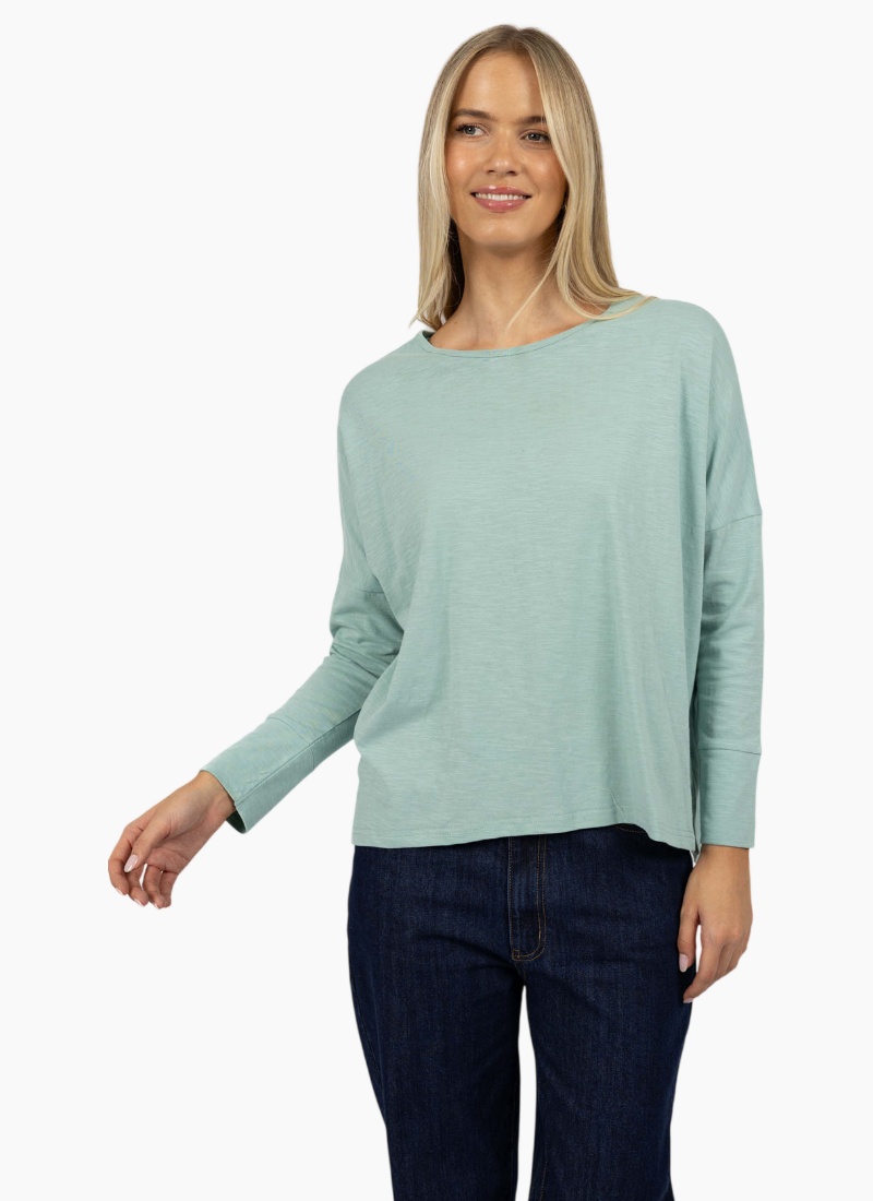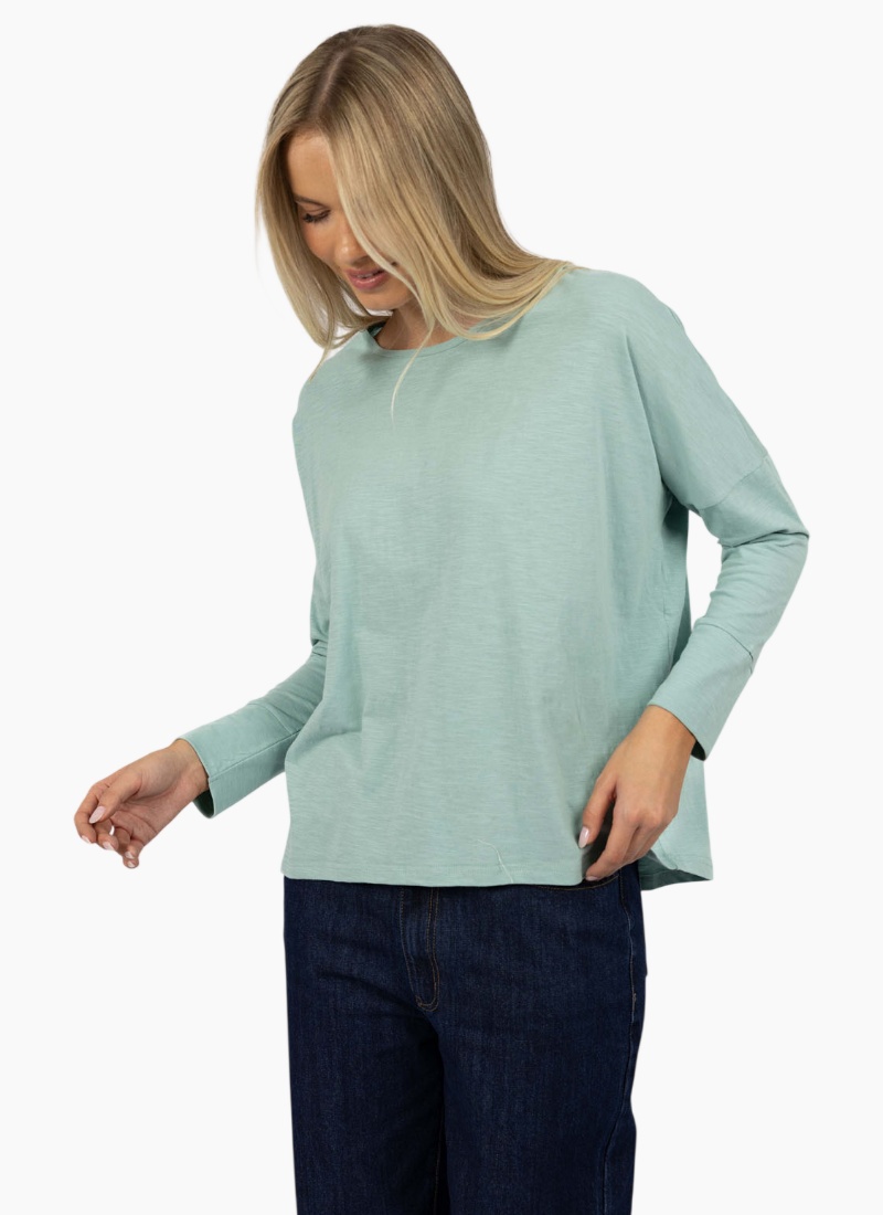 - A pared-back long-sleeve tee in a soft surf green that’s perfect for everyday wear and effortless layering.