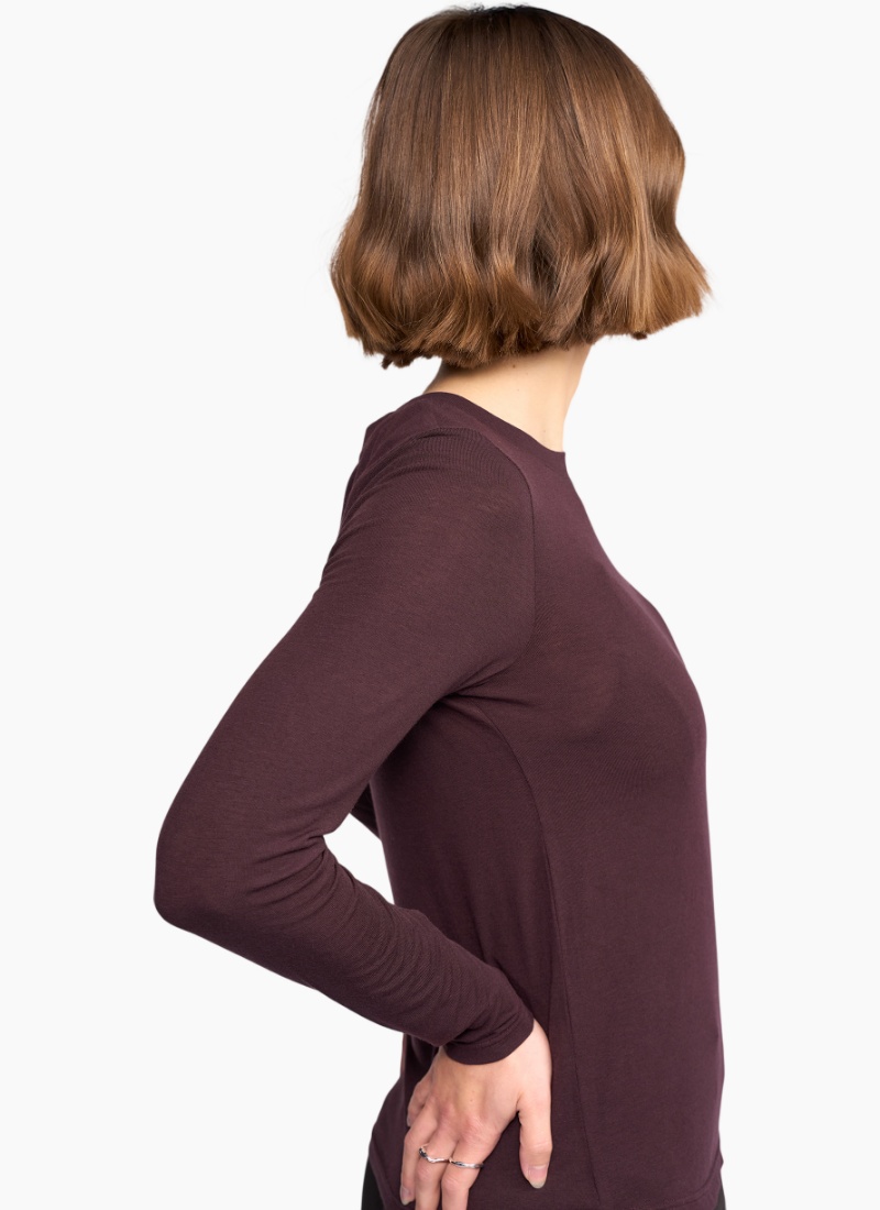 Everyday long sleeve top in Raisin, a rich, deep purplish hue, crafted from a soft Tencel, wool, and elastane blend. Featuring a round neckline and a relaxed, comfortable fit, this versatile top is perfect for layering or wearing on its own.