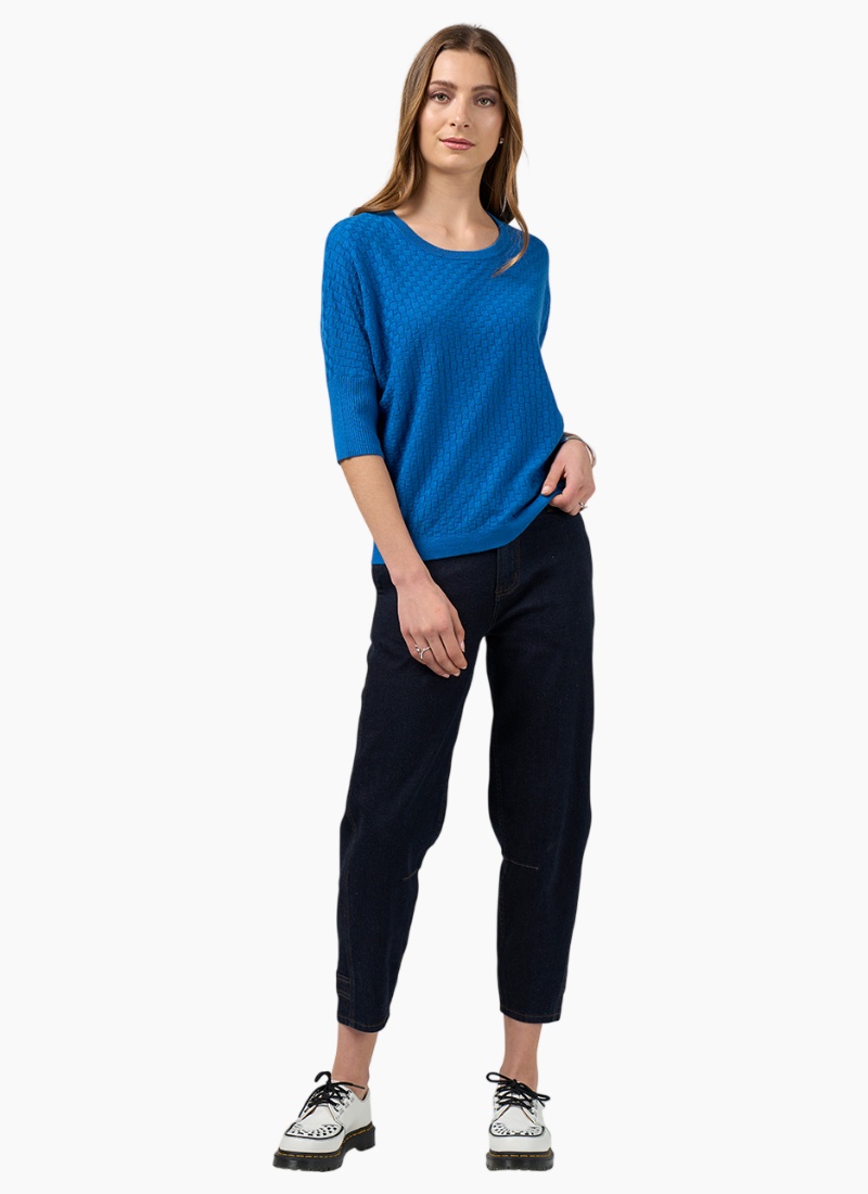 Introducing the Switchboard Tee from Madly Sweetly in True Blue. This textured cotton knit tee brings a polished, contemporary edge to everyday wardrobe staples.
