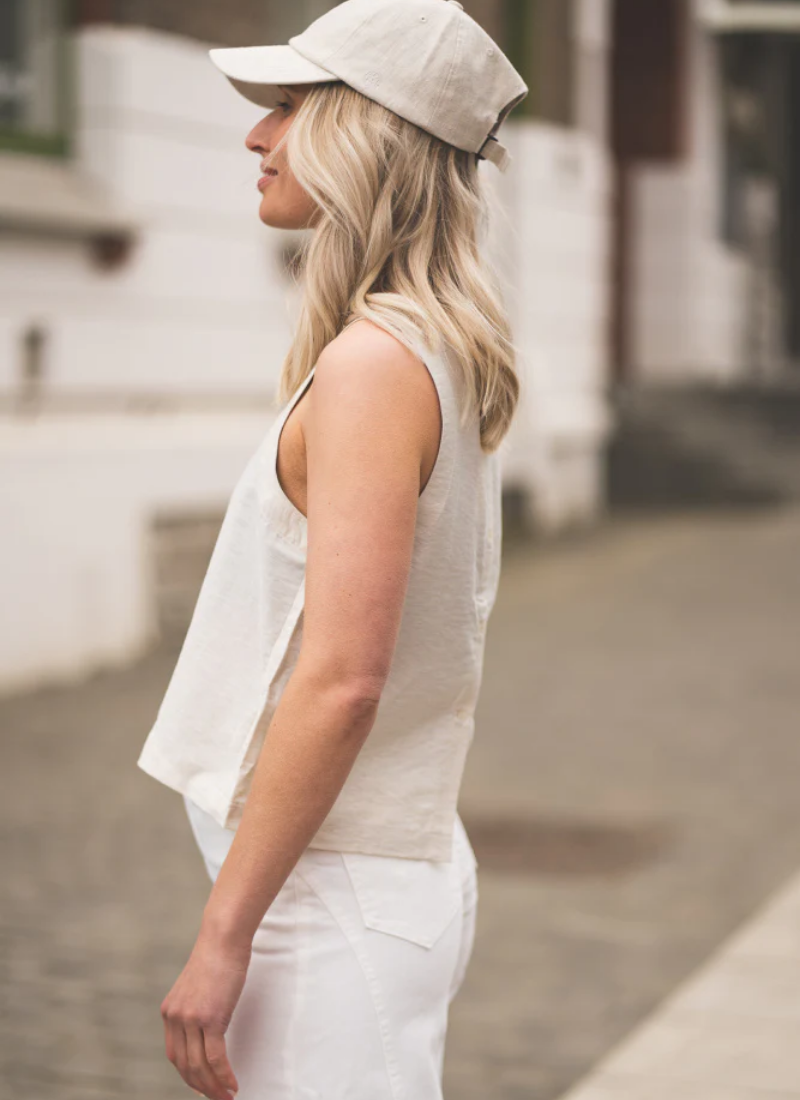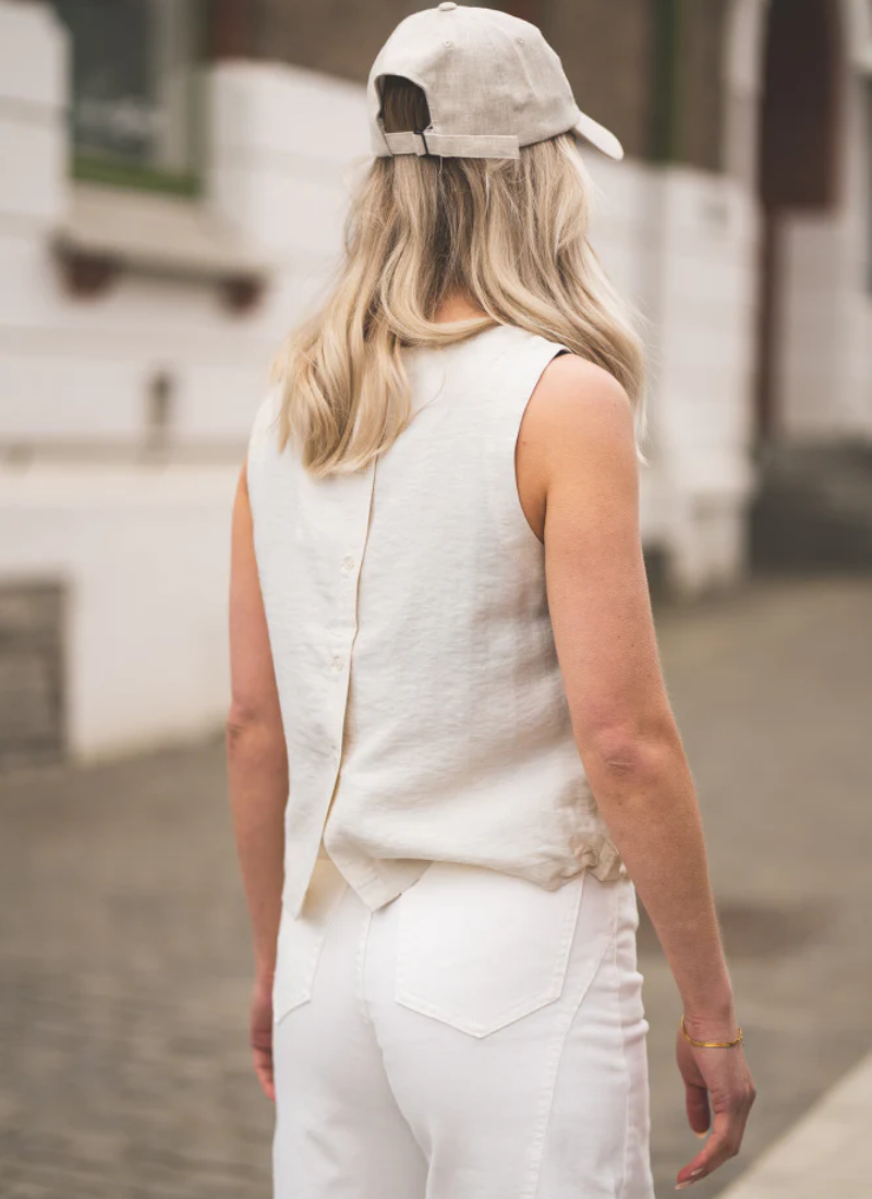 Disa is a lightweight material, ideal for the warm summer days. This top has a simple sleeveles design, with button detailing on the back.