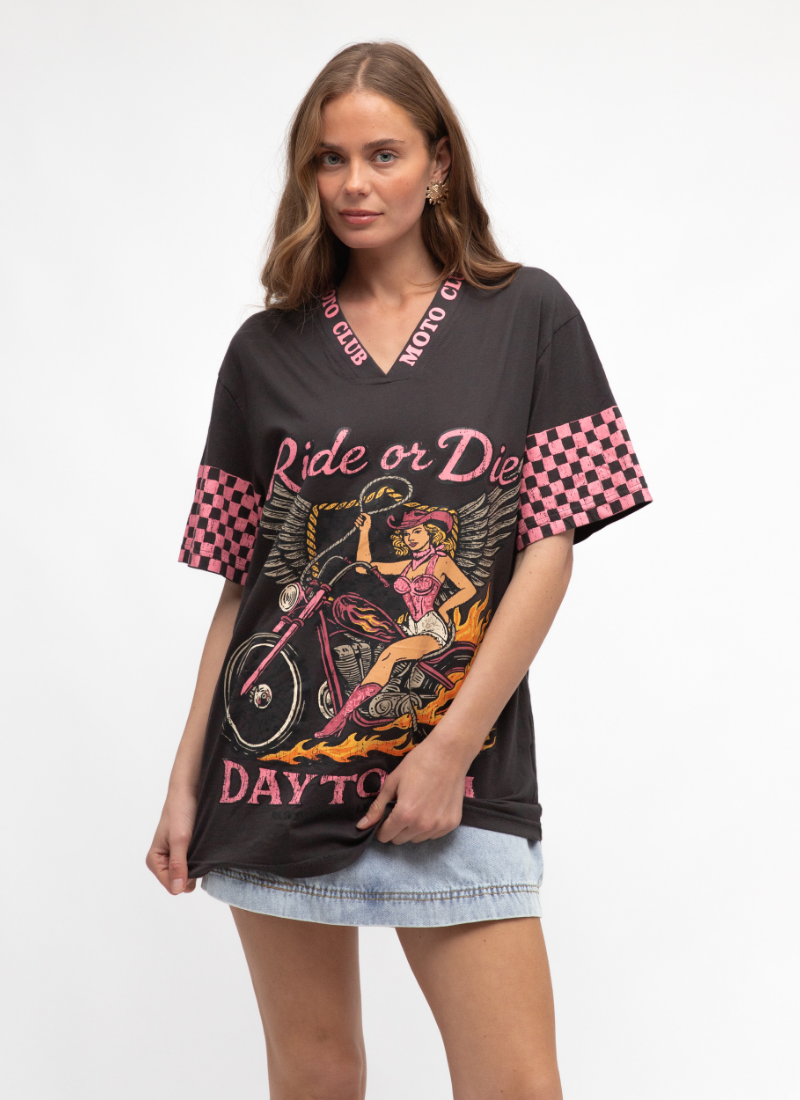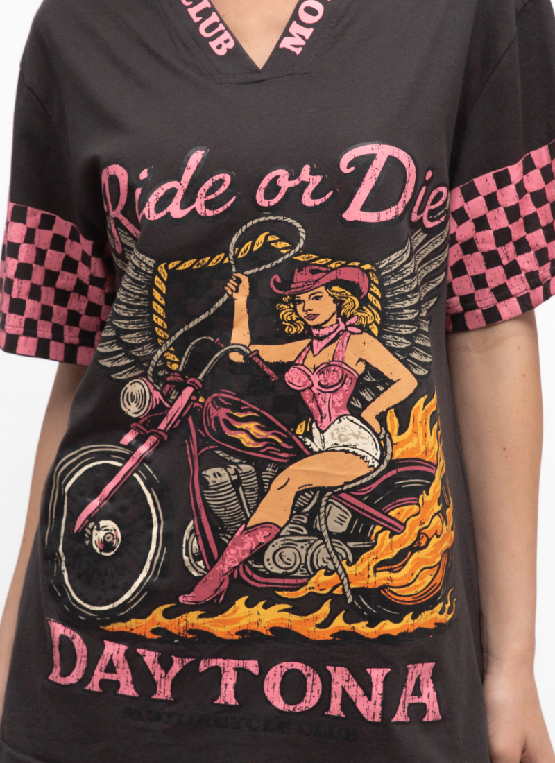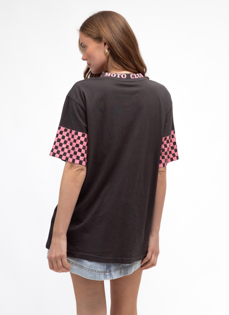 Introducing the Daytona Relaxed fit Tee VINTAGE from Paper Heart. This bold graphic tee channels 60's style art with playful pink accents and checkerboard sleeve detail.