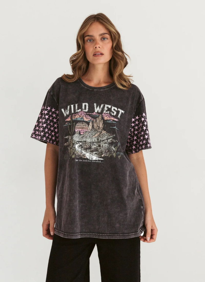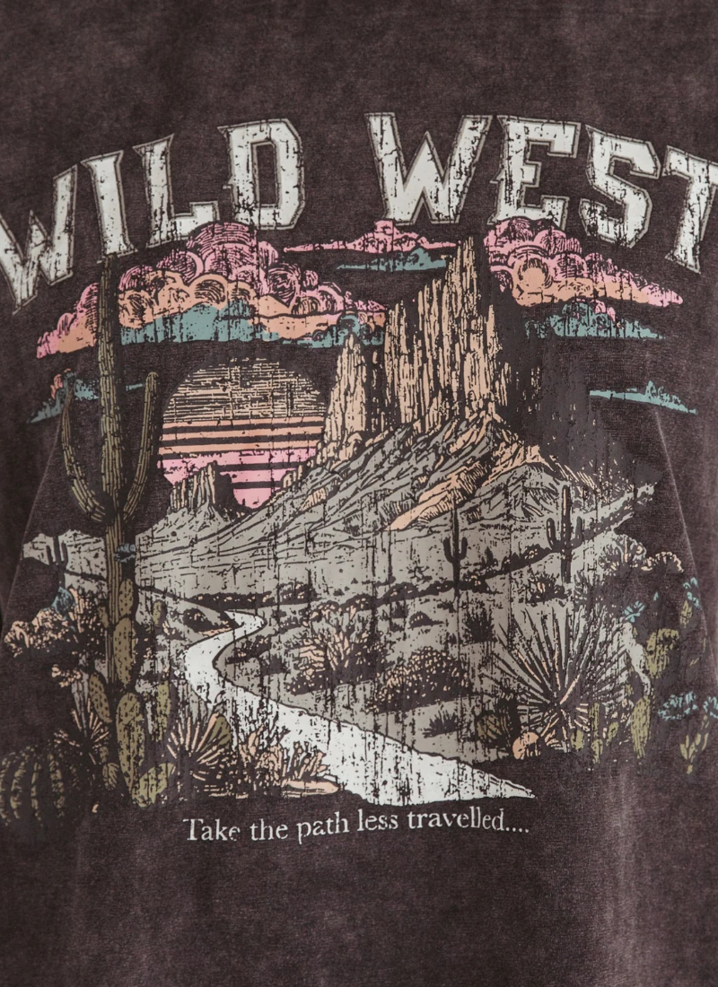 Introducing the Wild West Tee from Paper Heart. This vintage-inspired women's tee showcases a faded desert graphic and lived-in wash for easy, everyday cool.