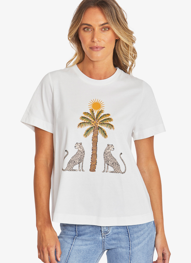 Introducing the Ping Pong Cheetah Tee Ivory — a relaxed graphic tee that brings playful safari charm to your everyday wardrobe. Perfect as a casual staple, it features a bold palm-and-cheetah print on an ivory backdrop.