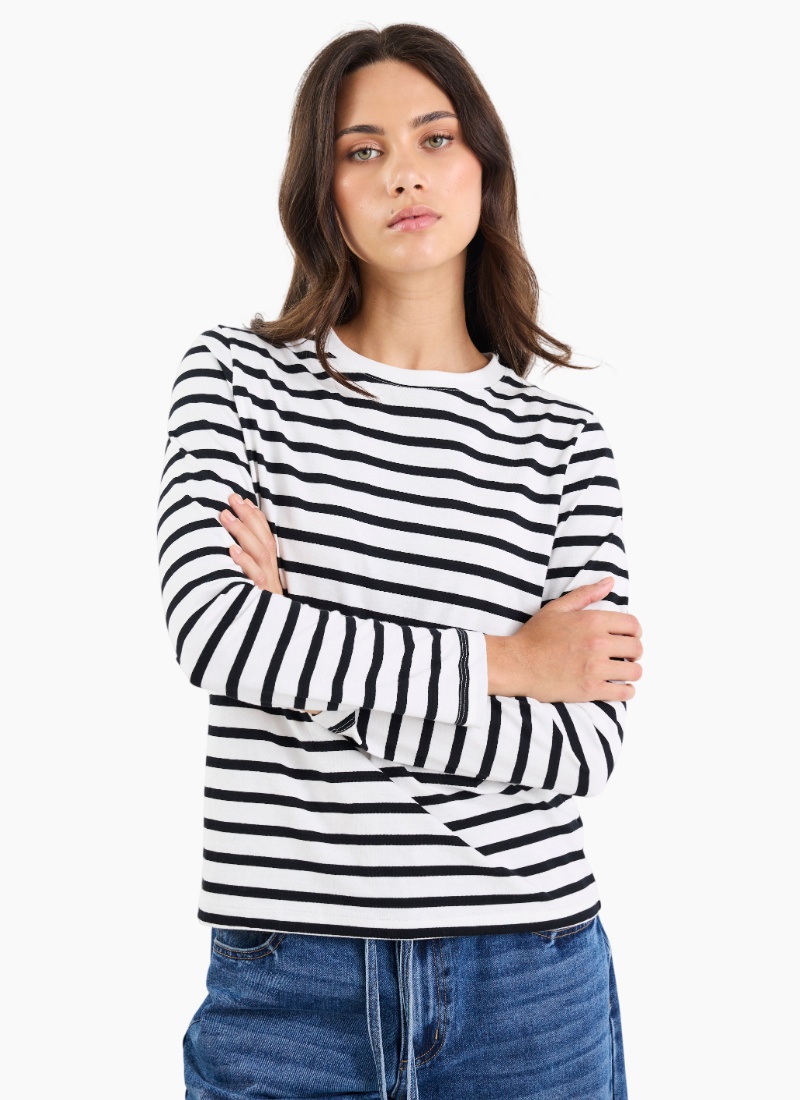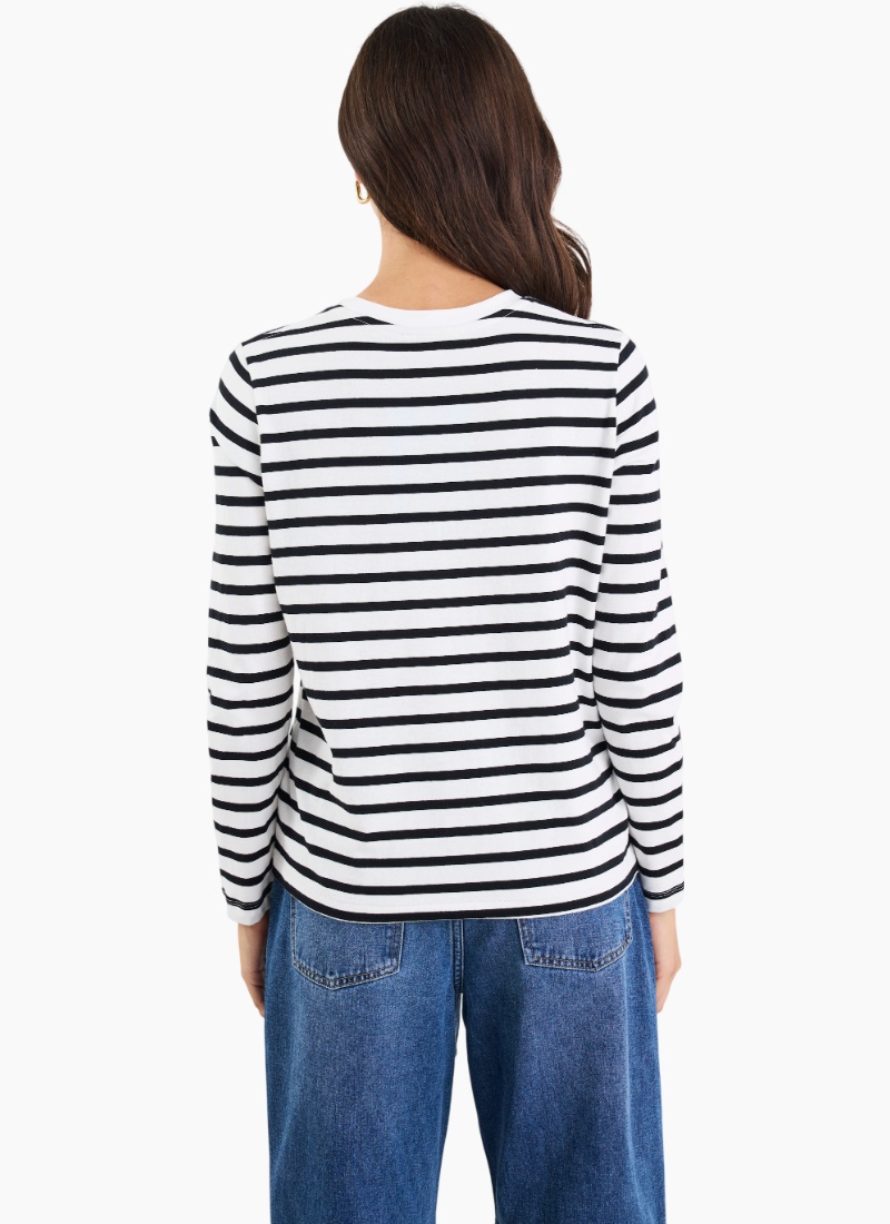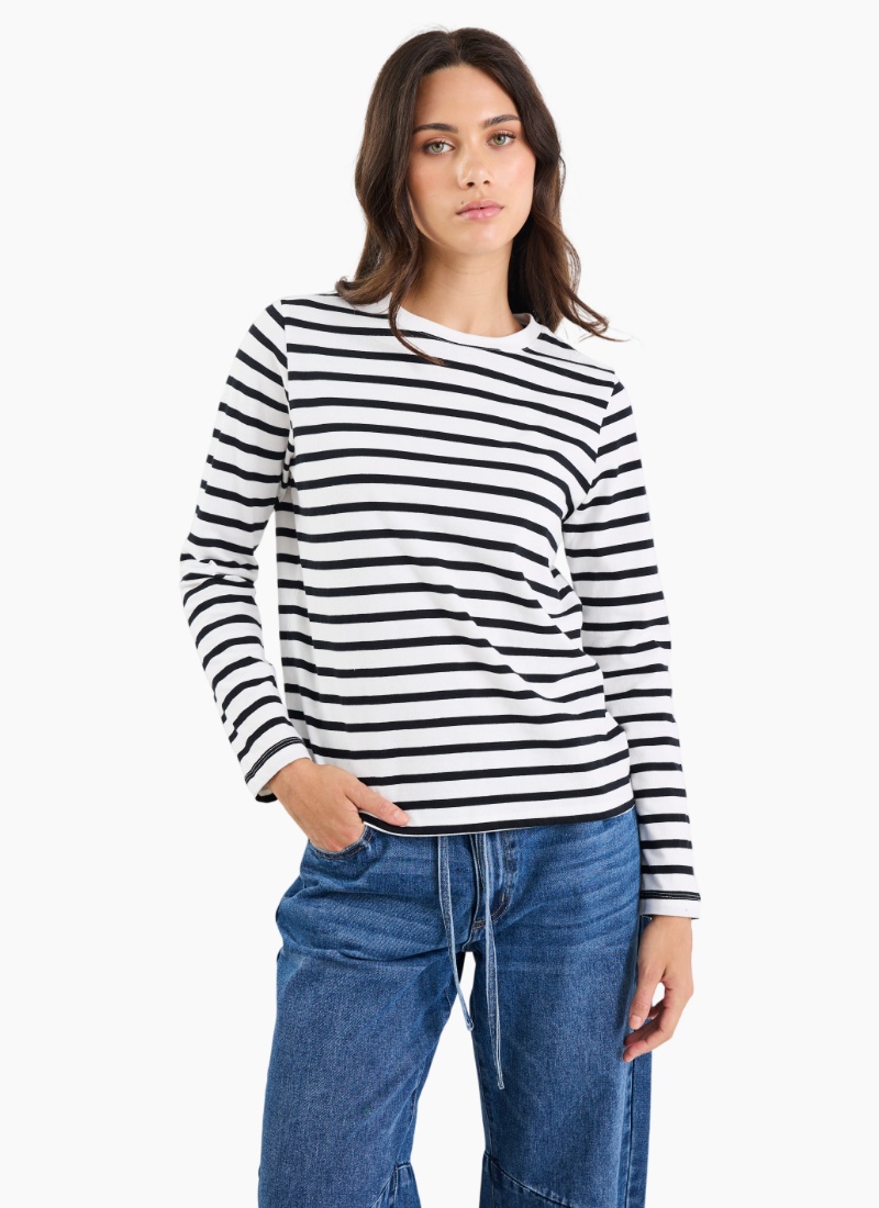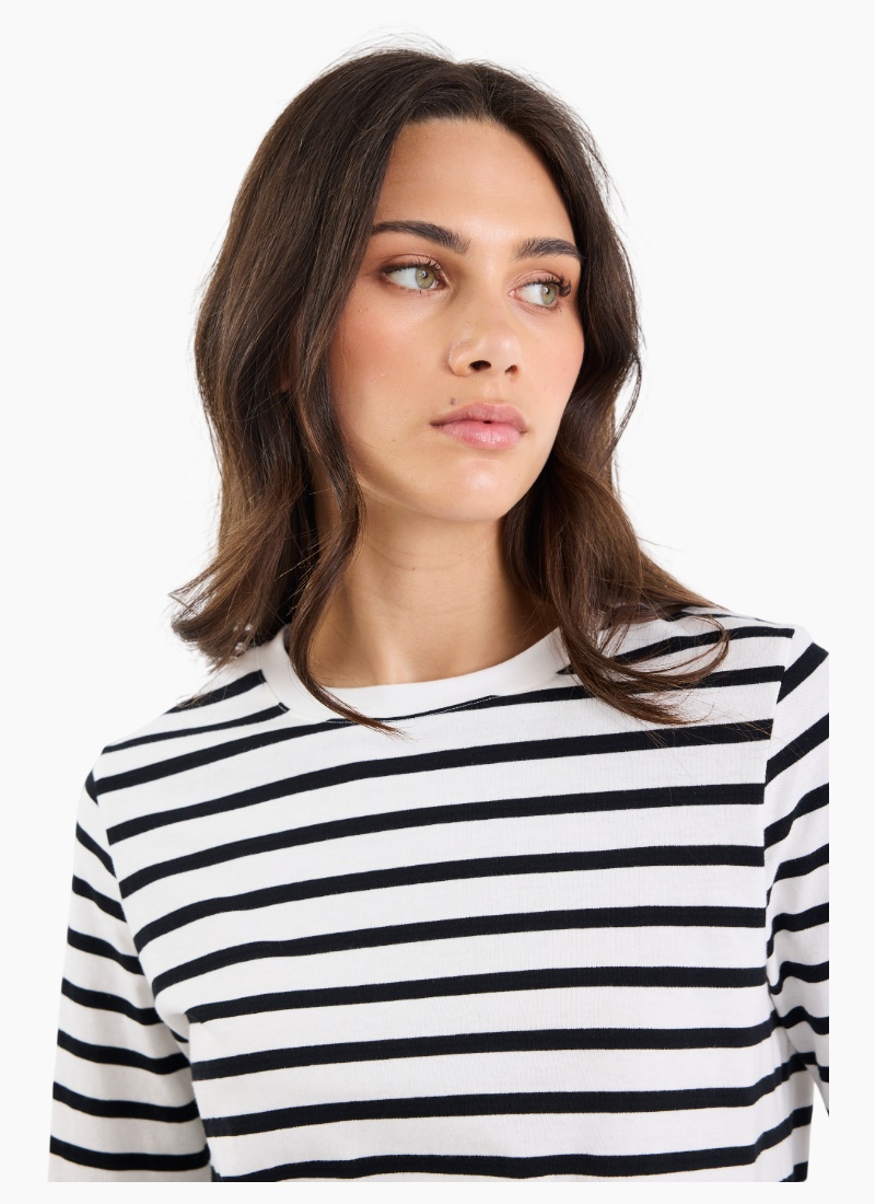 A timeless stripe with a fresh, relaxed twist, the Tether tee is your new off-duty essential. Cut in a boxy silhouette with a soft drape, it pairs comfort with cool for easy everyday styling. Think coastal classic meets casual street style. Perfect for high-low dressing, it looks just as good with denim and slides as it does under a blazer or trench.