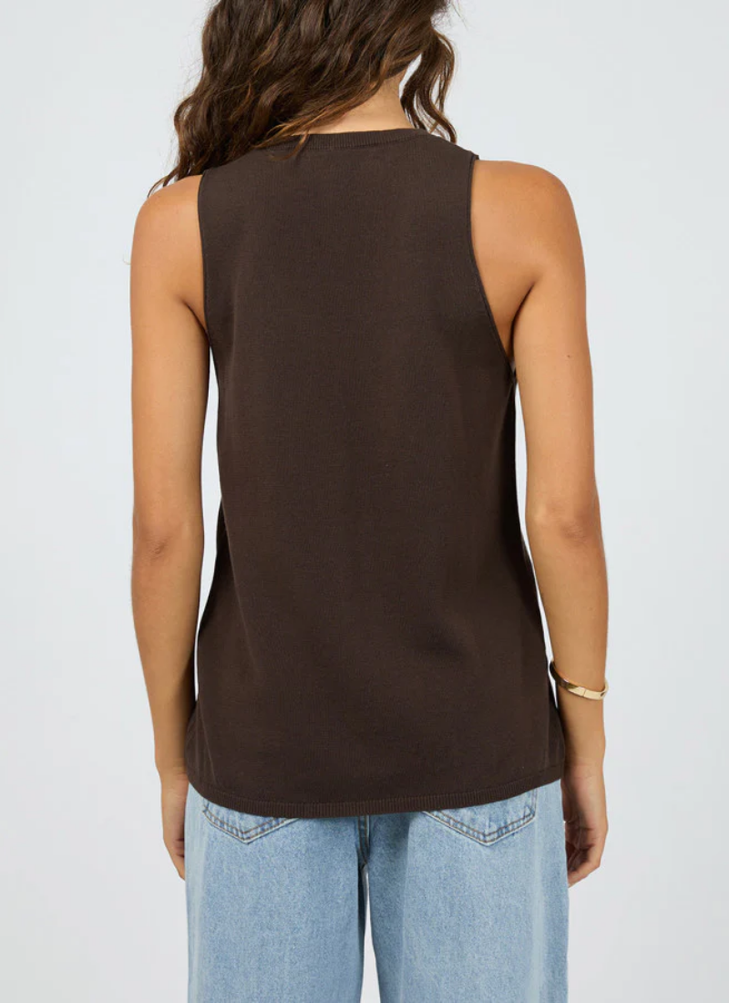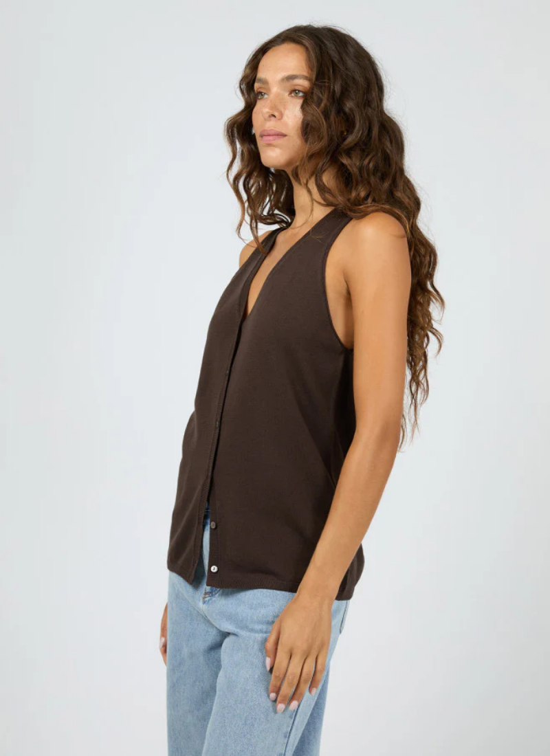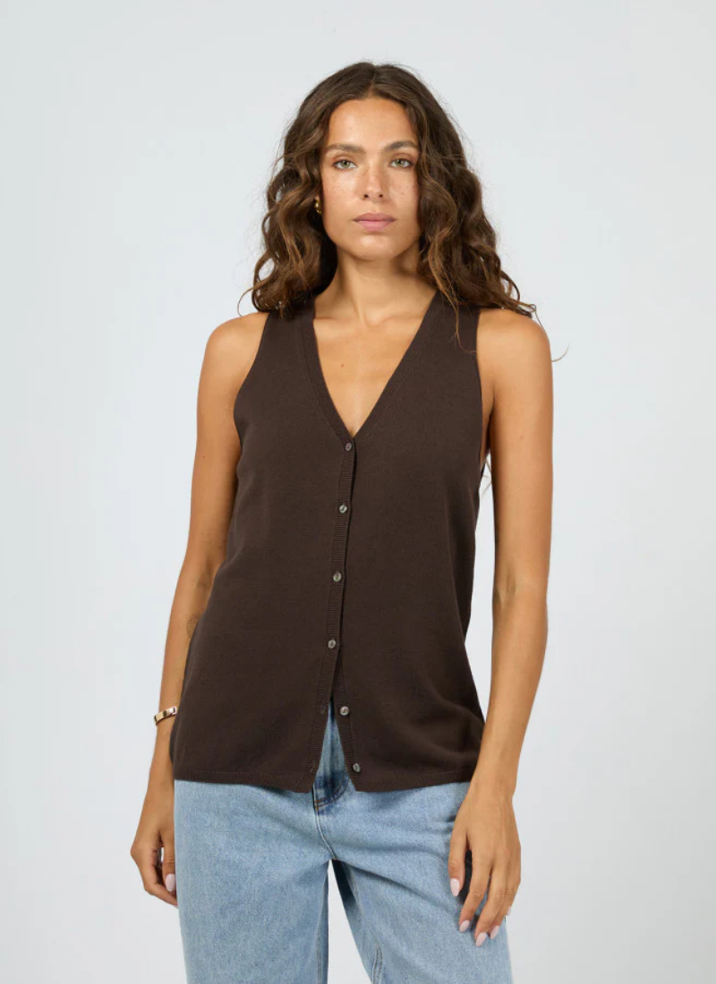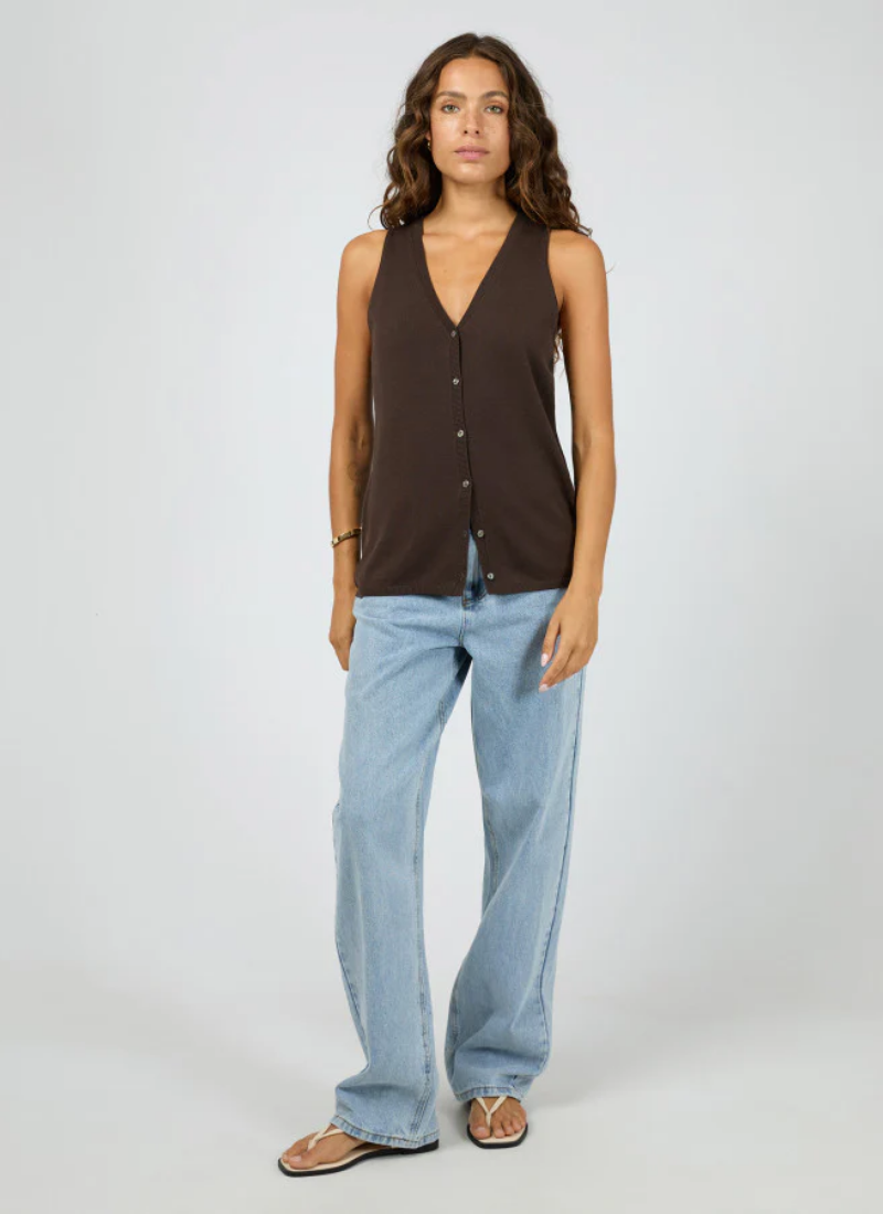Effortless takes form with our Ellis Vest Top. Made from a lightweight knit, this is the perfect on the go top. Featuring a button down front, with a relaxed fit and v neckline. Pair back with the Jade Baggy Jeans for the easiest day to night look.