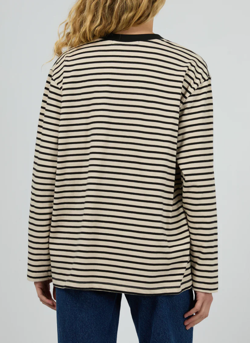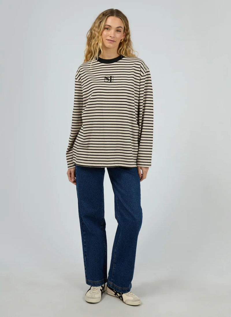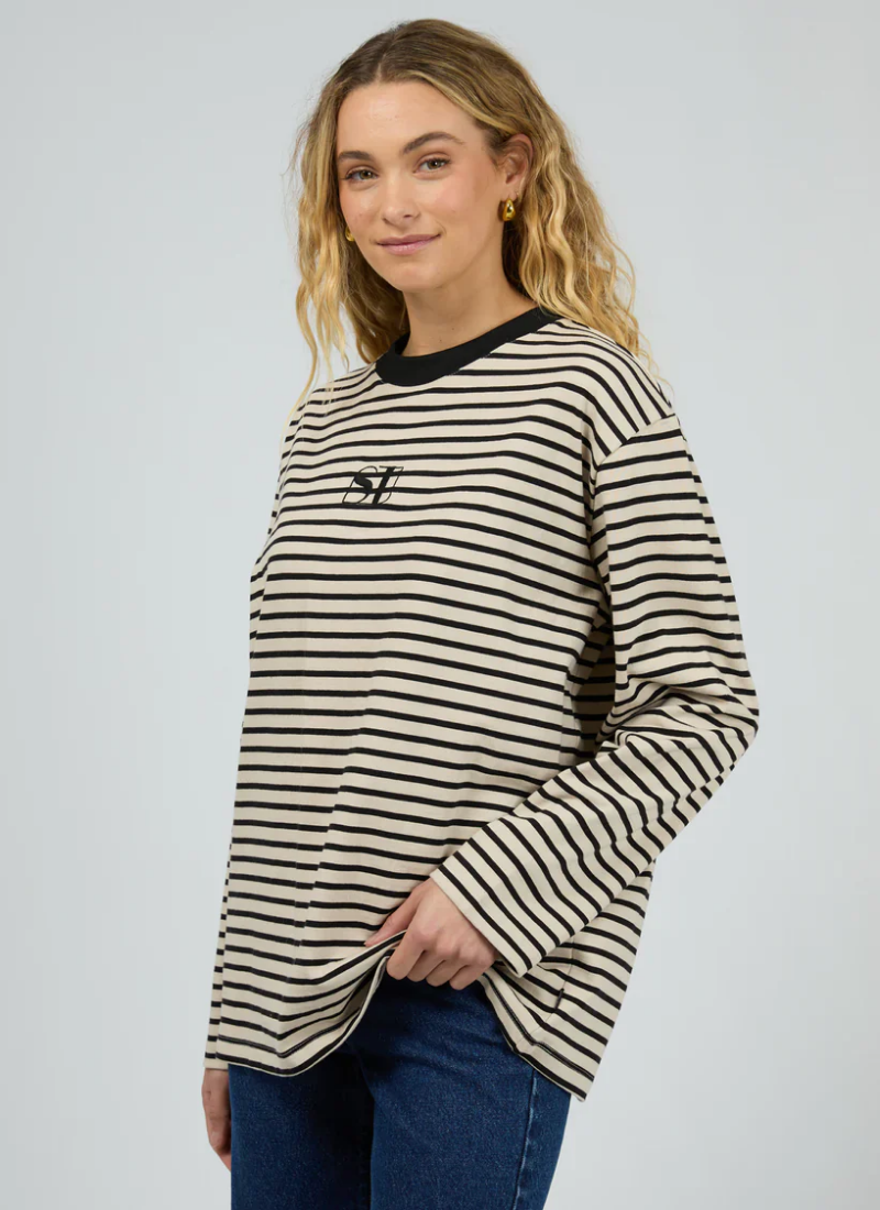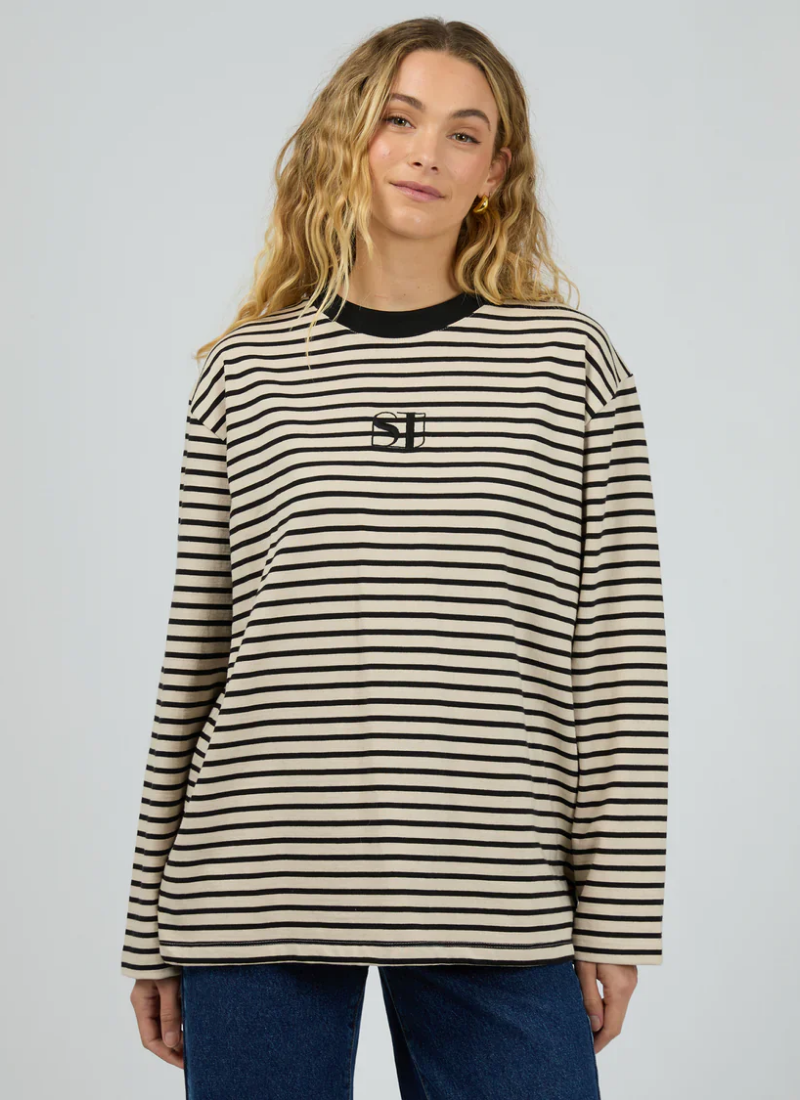 Elevate your basics with our Silent Stripe L/S Tee. Made from a soft heavy weight jersey this tee has an oversized fit that keeps its structure as well as a branded embroidery and yarn dyed stripe design. From walks with friends to work, this tee can take you anywhere. Oversized Fit Embroidery Hit Heavy Weight Jersey Model wears Size 8