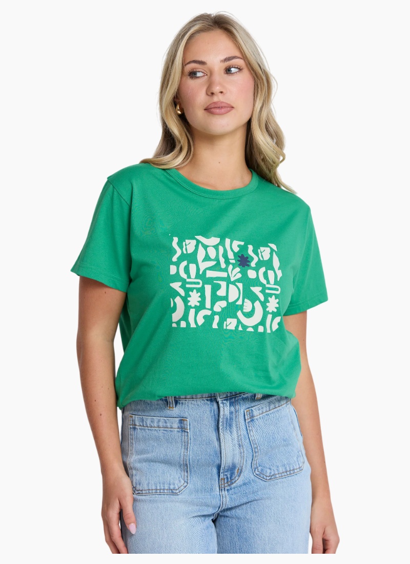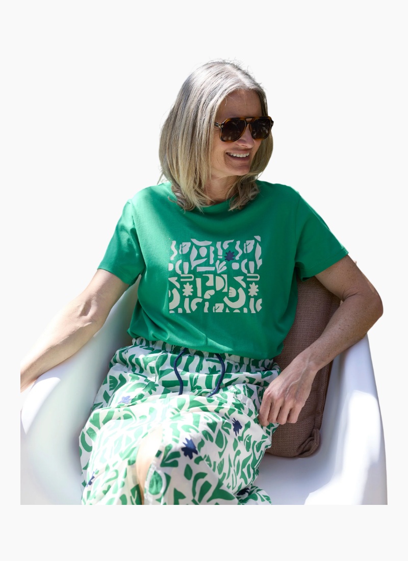Introducing the Ace Tee Grass Green Geo from Stella + Gemma. This cheerful grass green tee is finished with a bold geometric print for an effortless, modern look.