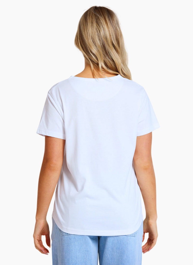 - A versatile womens' tee in white that pairs beautifully with denim or skirts