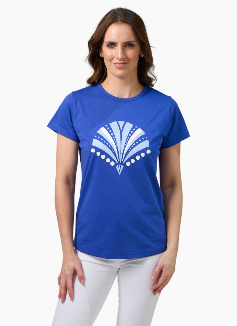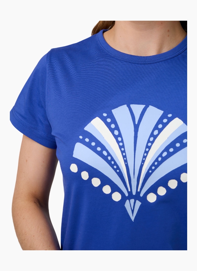 - Bold shell-inspired print in a paler blue provides a playful focal point against the electric blue colour