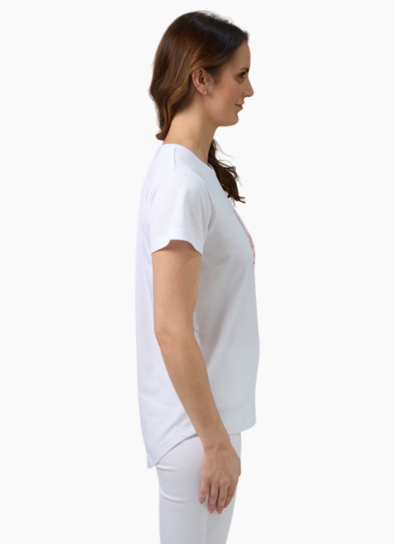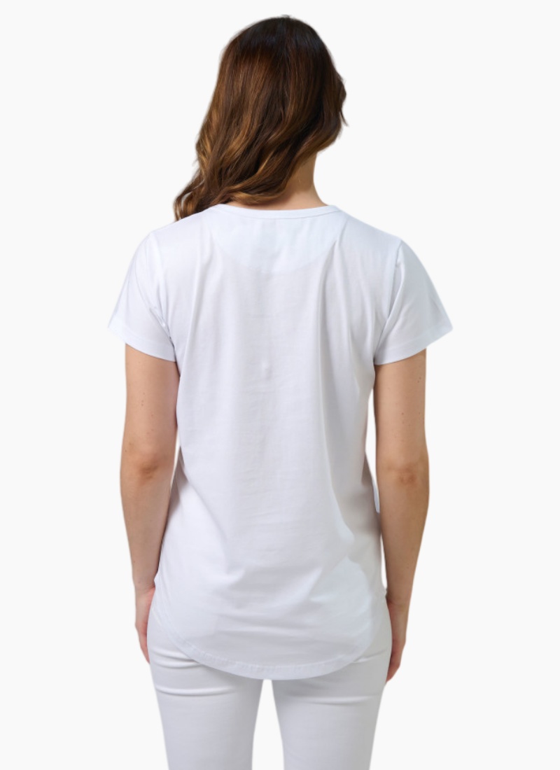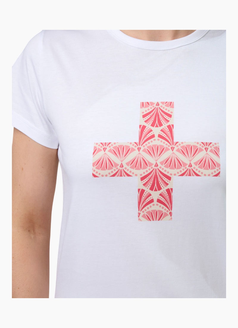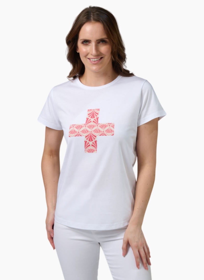 Introducing the Classic Tee White Strawberry from Stella + Gemma. This clean, contemporary tee features a charming strawberry-toned cross motif and is perfect for everyday wear.Relaxed fit crew neck with longer scoop hemline